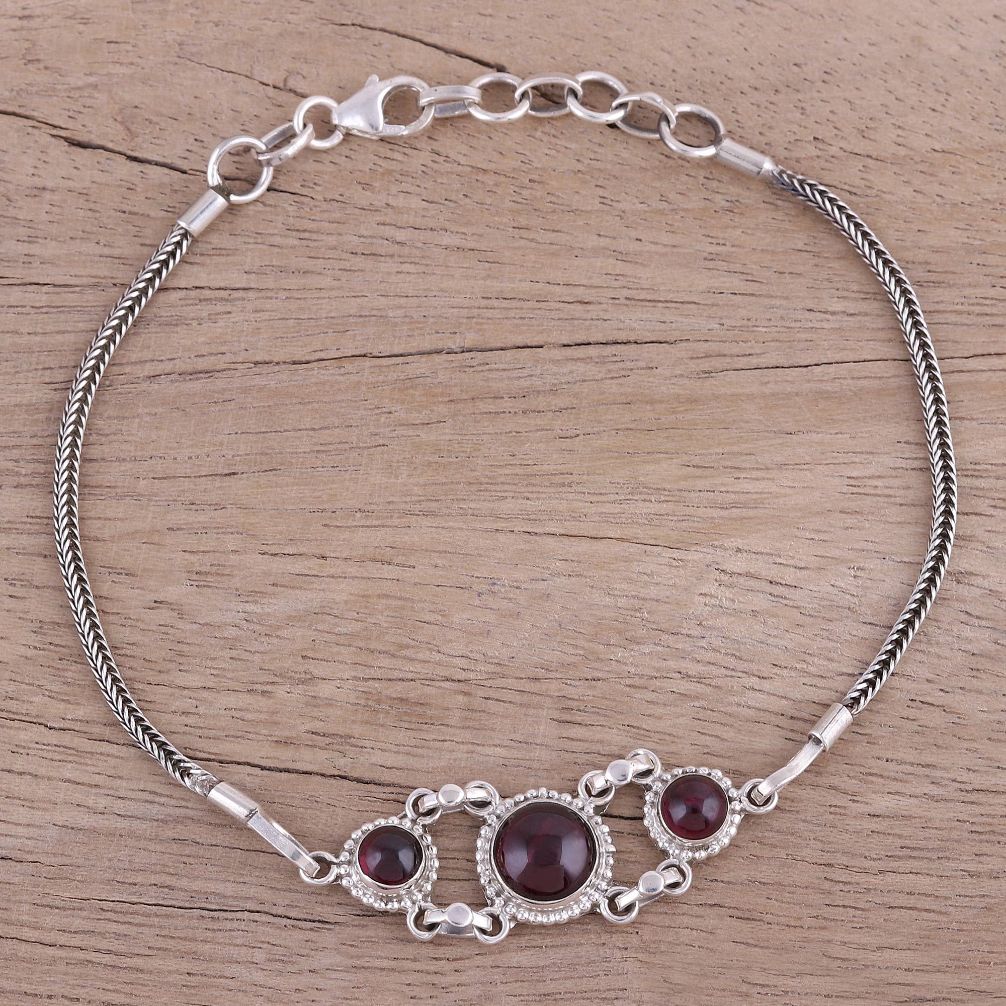 This dramatic pendant bracelet comes to us from India's Alok Jain. Artisans craft the bracelet from sterling silver, with lengths of foxtail chain that flank a three-gemstone pendant. Smooth, crimson cabochons of garnet are set in the bead-edged silver bezels. The gemstones are linked together with polished sterling silver links.
