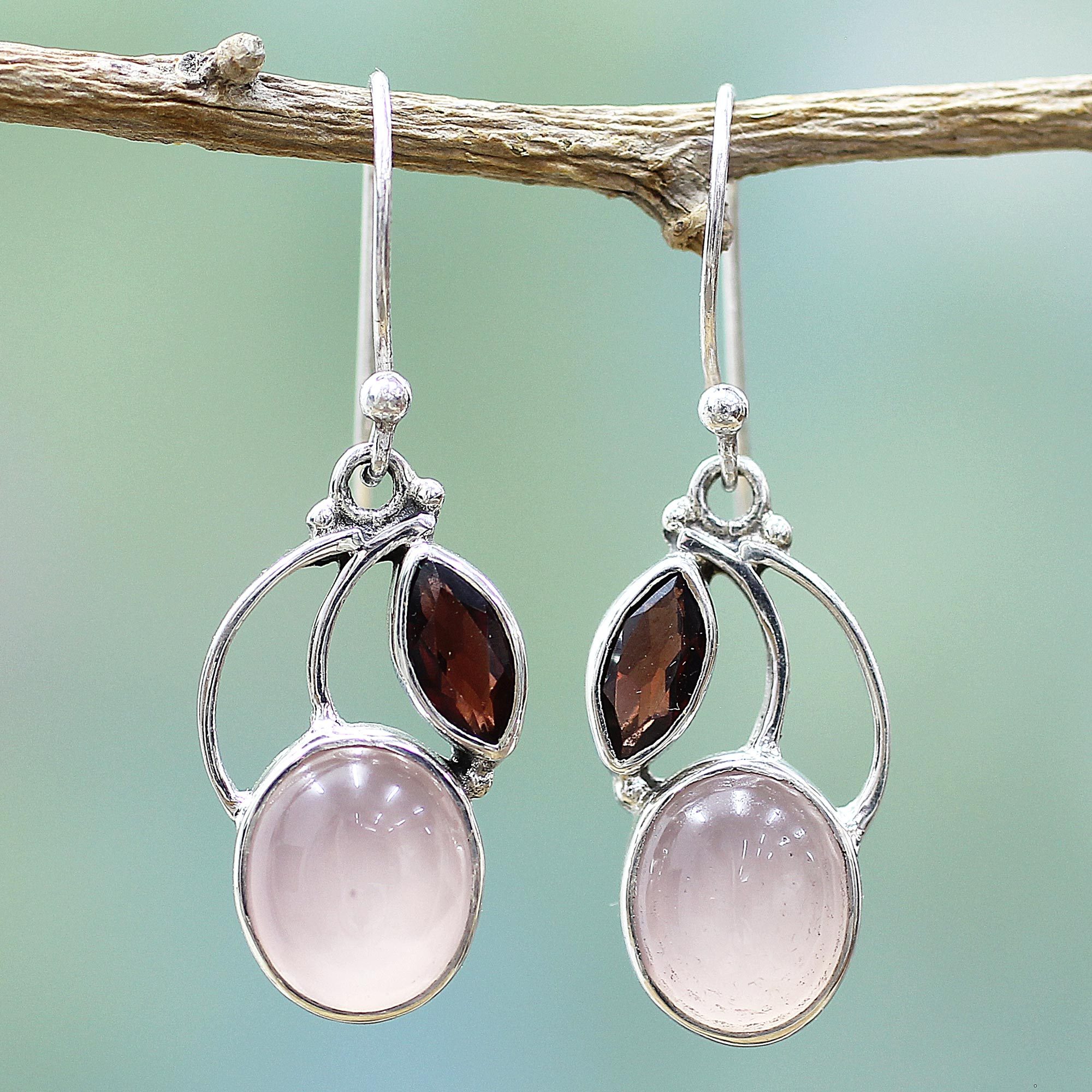 Garnet Chalcedony Sterling Silver Dangle Earrings India, 'Pink Fog'