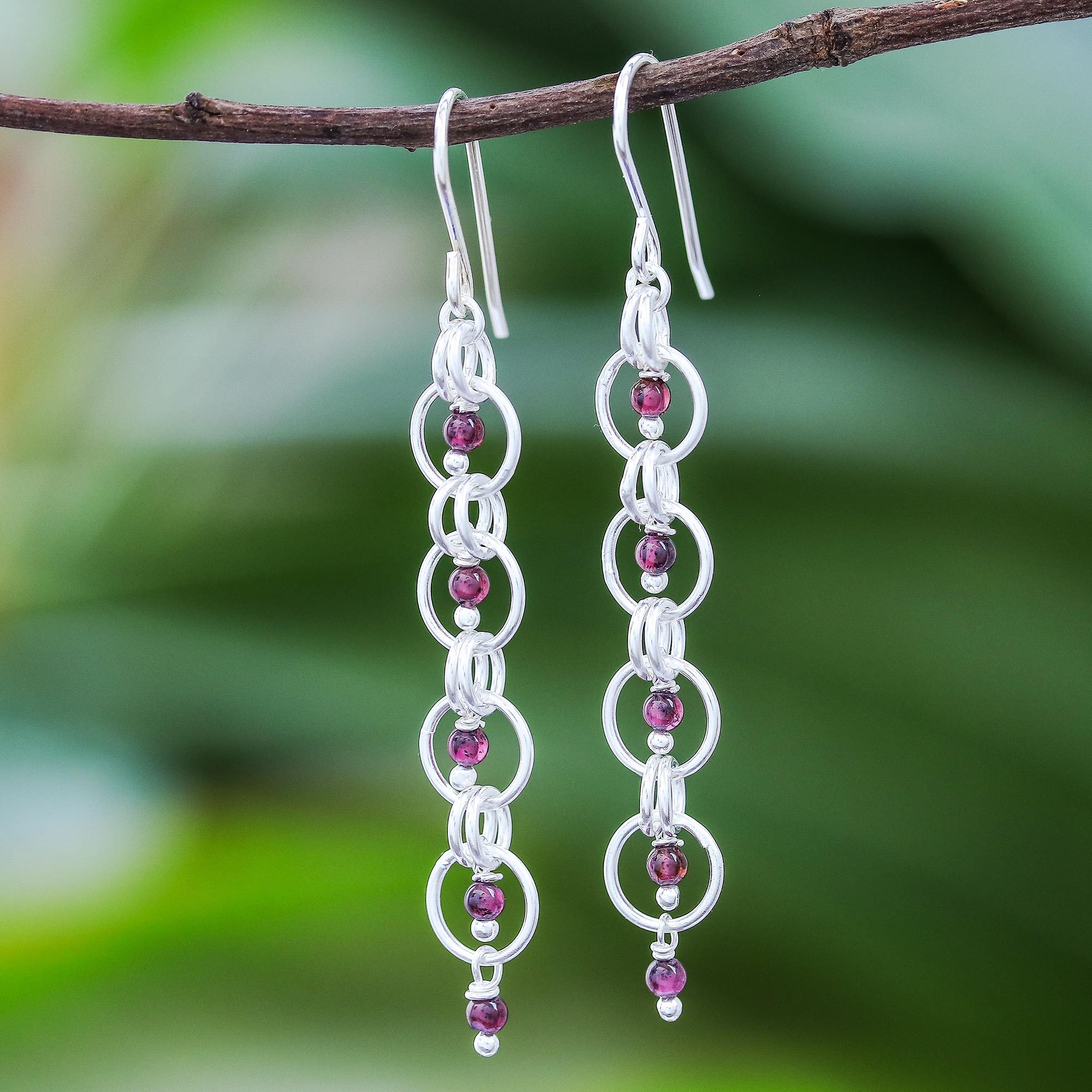 Garnet Dangle Earrings with Sterling Rings from Thailand, 'Ringed Gems'
