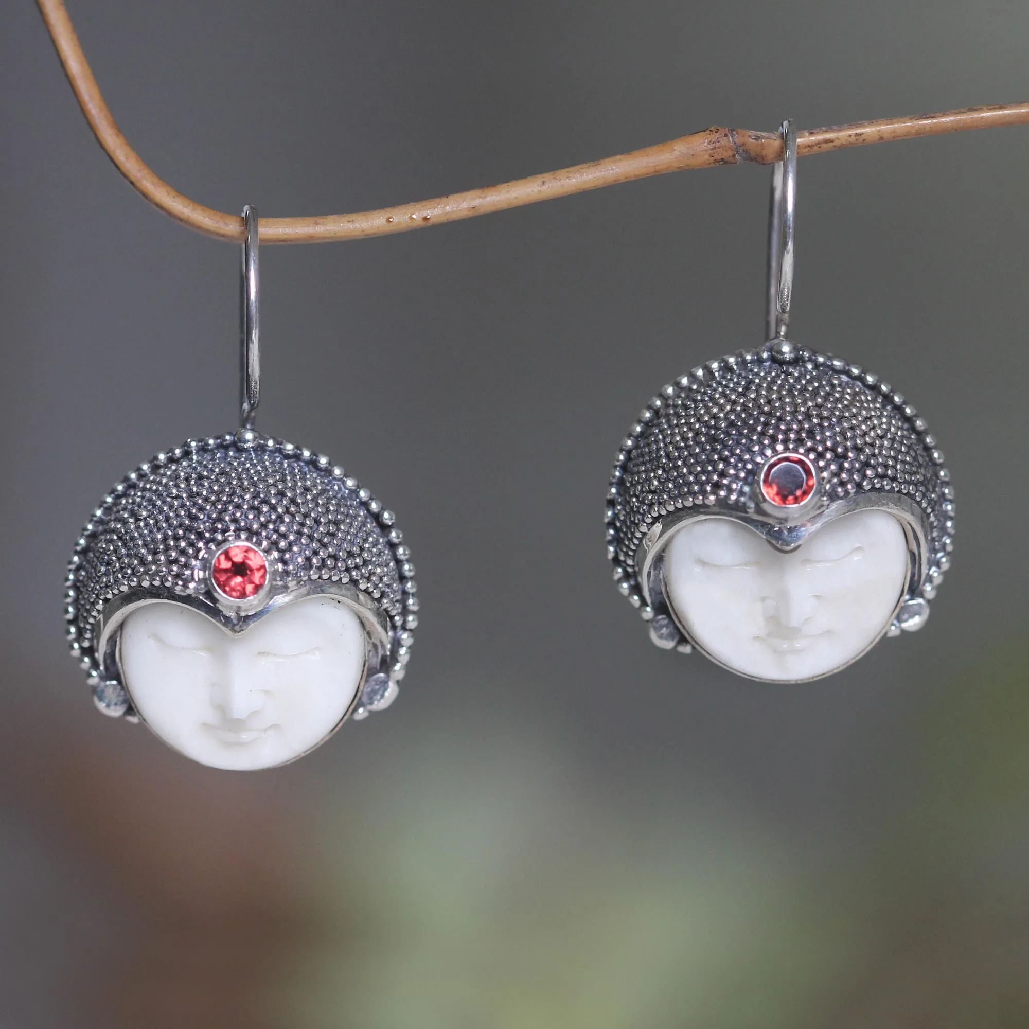 Carved from bone, the ivory features of a princess are quiet and peaceful. Komang Suastra crowns the lovely lady with sterling silver set with a faceted garnet.