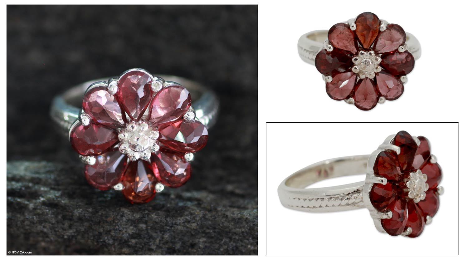 Crimson petals burst into bloom, forming a dazzling flower. Set in silver, faceted garnets total 4 sparkling carats. From Alok Jain, this sumptuous ring is feminine and beautiful.
