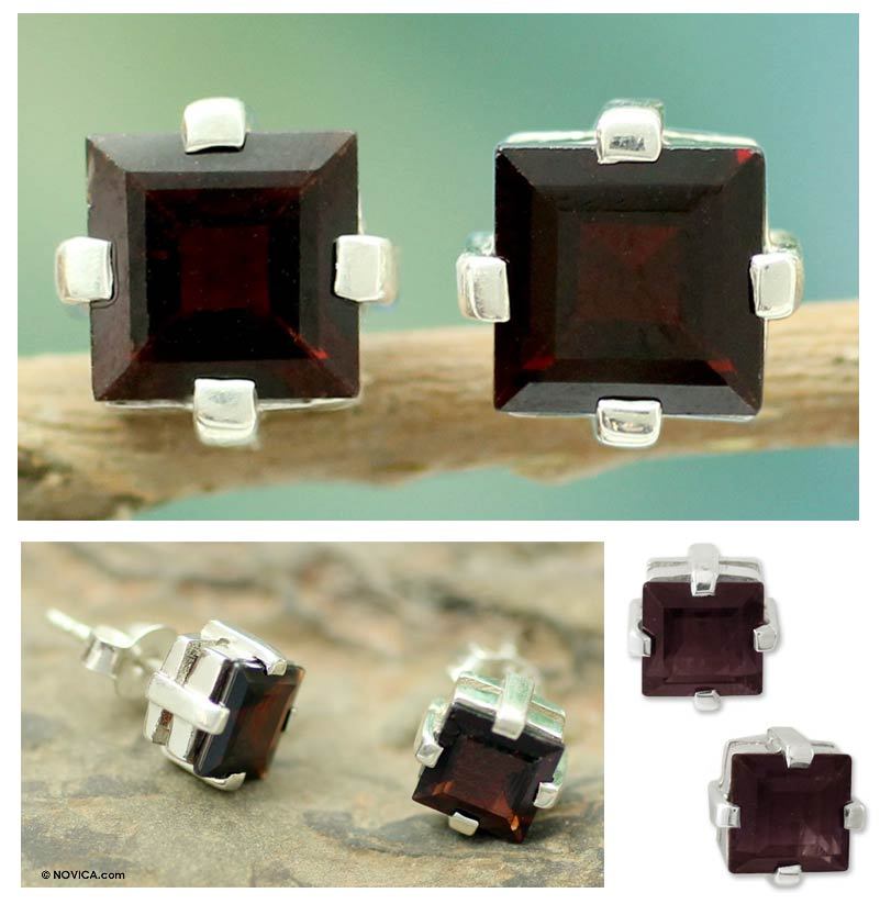 Garnet Studs Artisan Crafted Sterling Silver Earrings, 'Crimson Charm'