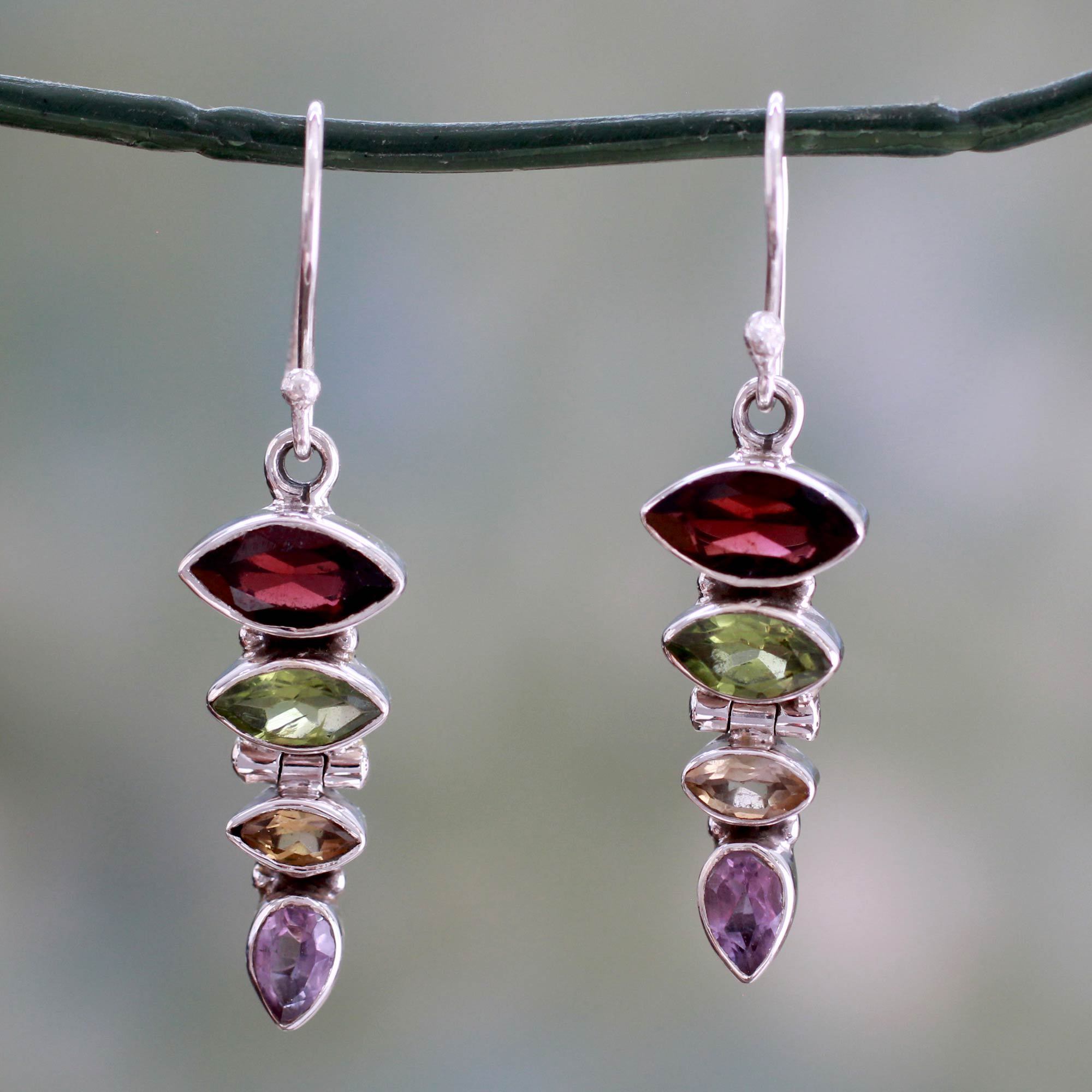 A dazzling quartet of gemstones adorns these original earrings from Shanker of India. Marquise-cut garnet, peridot and citrine are stacked atop a pear-shaped amethyst, all set in polished sterling silver. The earrings dangle from sterling silver hooks.
