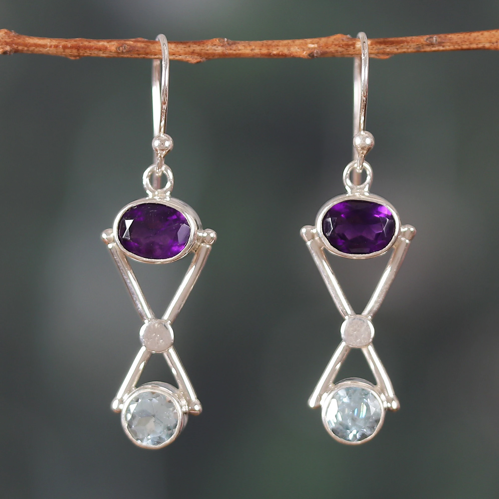 Transport your style to the sophisticated future and enjoy its dapper aura with this pair of sterling silver dangle earrings by Indian artisans. Presented by Neeru Goel, these geometric pieces feature a high polish finish that enriches the amethyst and blue topaz gems displayed in a bezel setting, totaling over four carats and attracting energies of wisdom and loyalty.