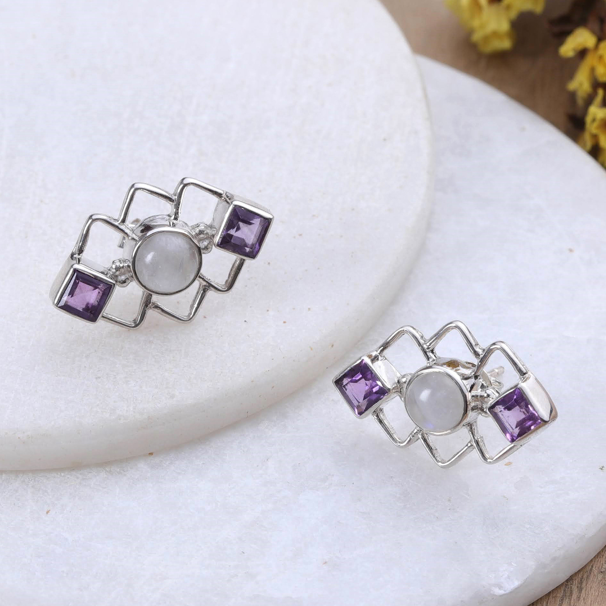 Geometric Amethyst and Rainbow Moonstone Button Earrings, 'Charismatic Harmony'