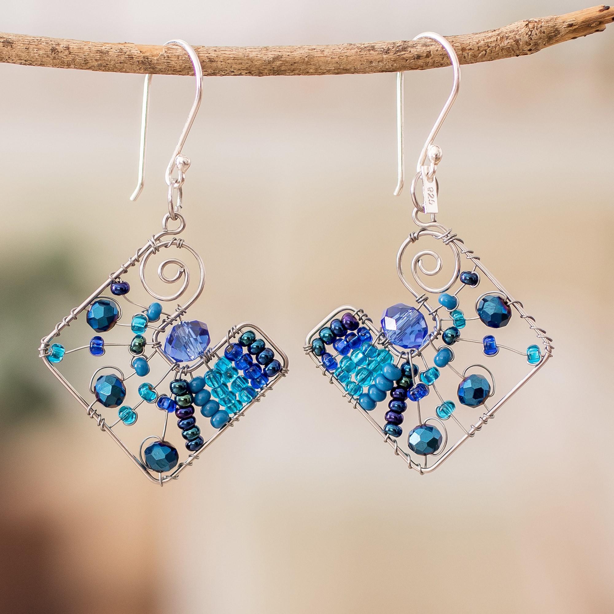 Guatemalan artisan Domingo Reanda uses stainless steel wires to create a magical design inspired by the beauty of the universe. These diamond-shaped dangle earrings feature a masterfully arranged crystal and glass beaded pattern that evokes the harmonious sensation of the constellations, all made with a blue palette that symbolizes intuition and imagination. As a touch of comfort, sterling silver hooks allow for easy use.