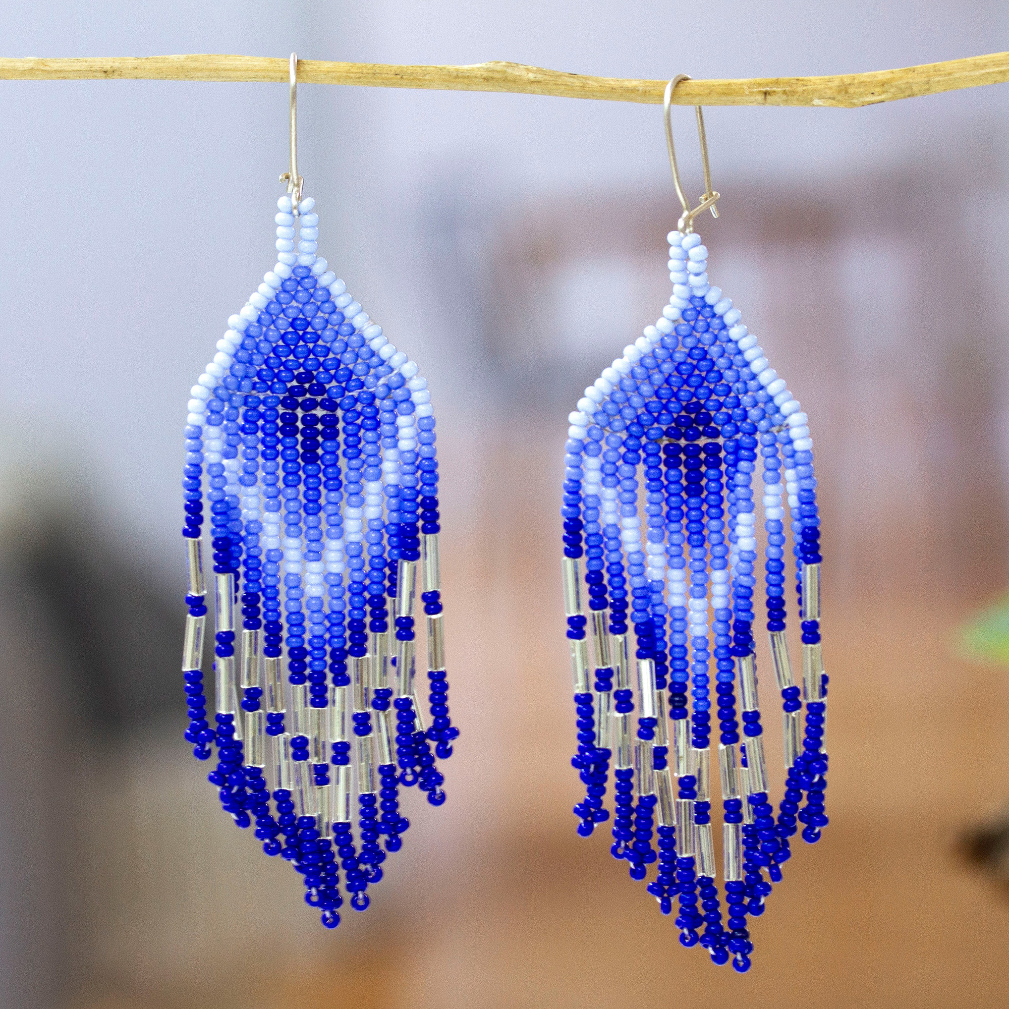 Shades of blue shower your style with magical and sublime sensations. Adriana Trejo of Mexico weaves each glass bead in a traditional geometric design, letting blue strands dance at the bottom of these waterfall earrings. Sterling silver hooks complete the piece with comfort.