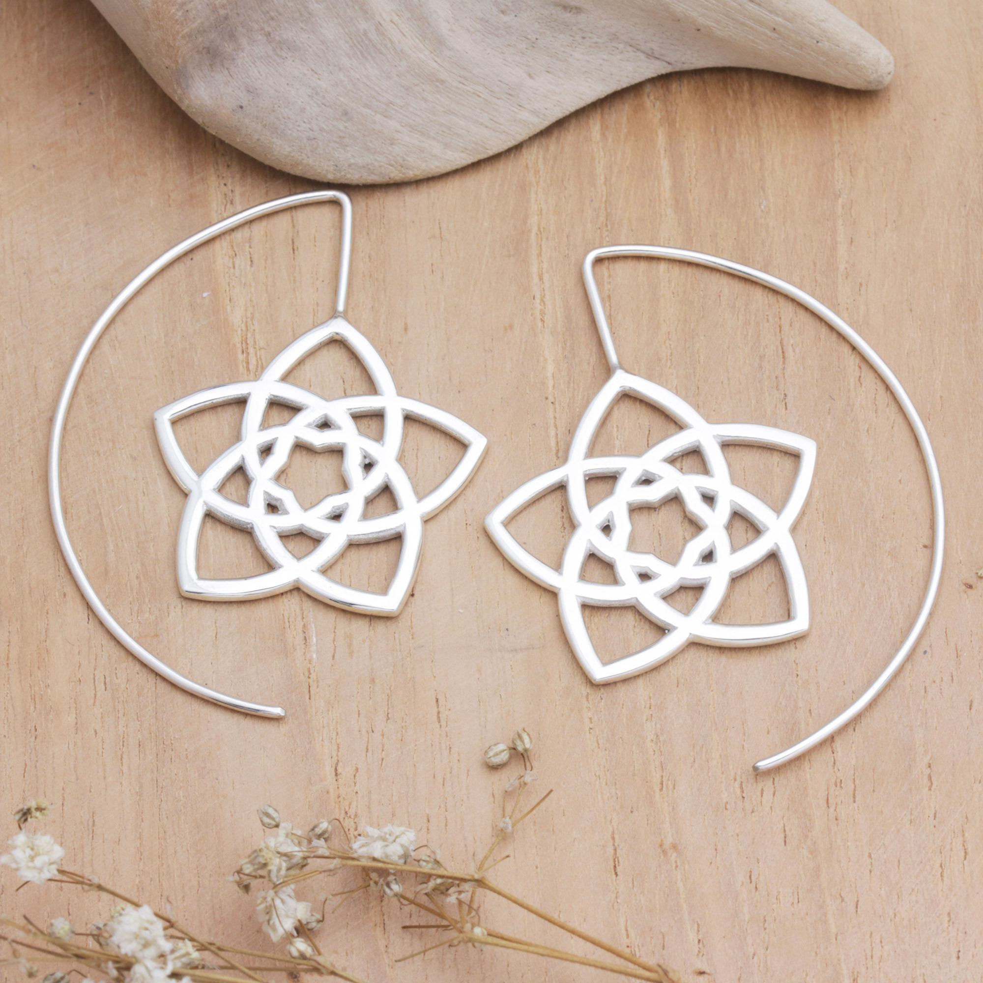 Wear a modern and captivating accessory inspired by spring and current fashion trends. Crafted in Bali from sterling silver, these drop earrings are another pretty creation by artisan Kadek Aridyah, who adds floral pendants with geometric formations to a glowing design perfect for any occasion.