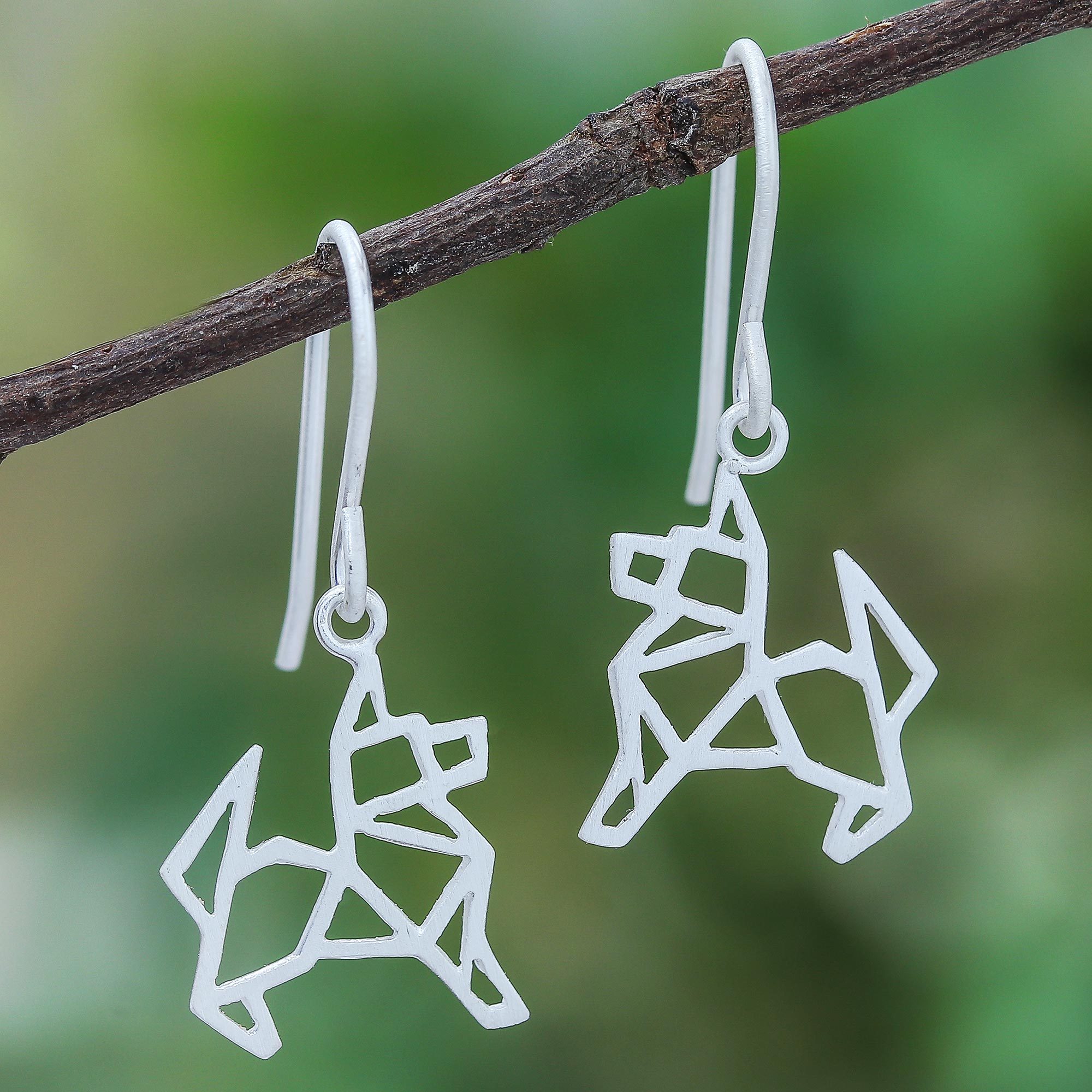Created by geometric forms, two delightful German shepherds adorn the ears. Thai artisan Jantana creates these dangle earrings, which are crafted from sterling silver and treated with a brushed-satin finish.