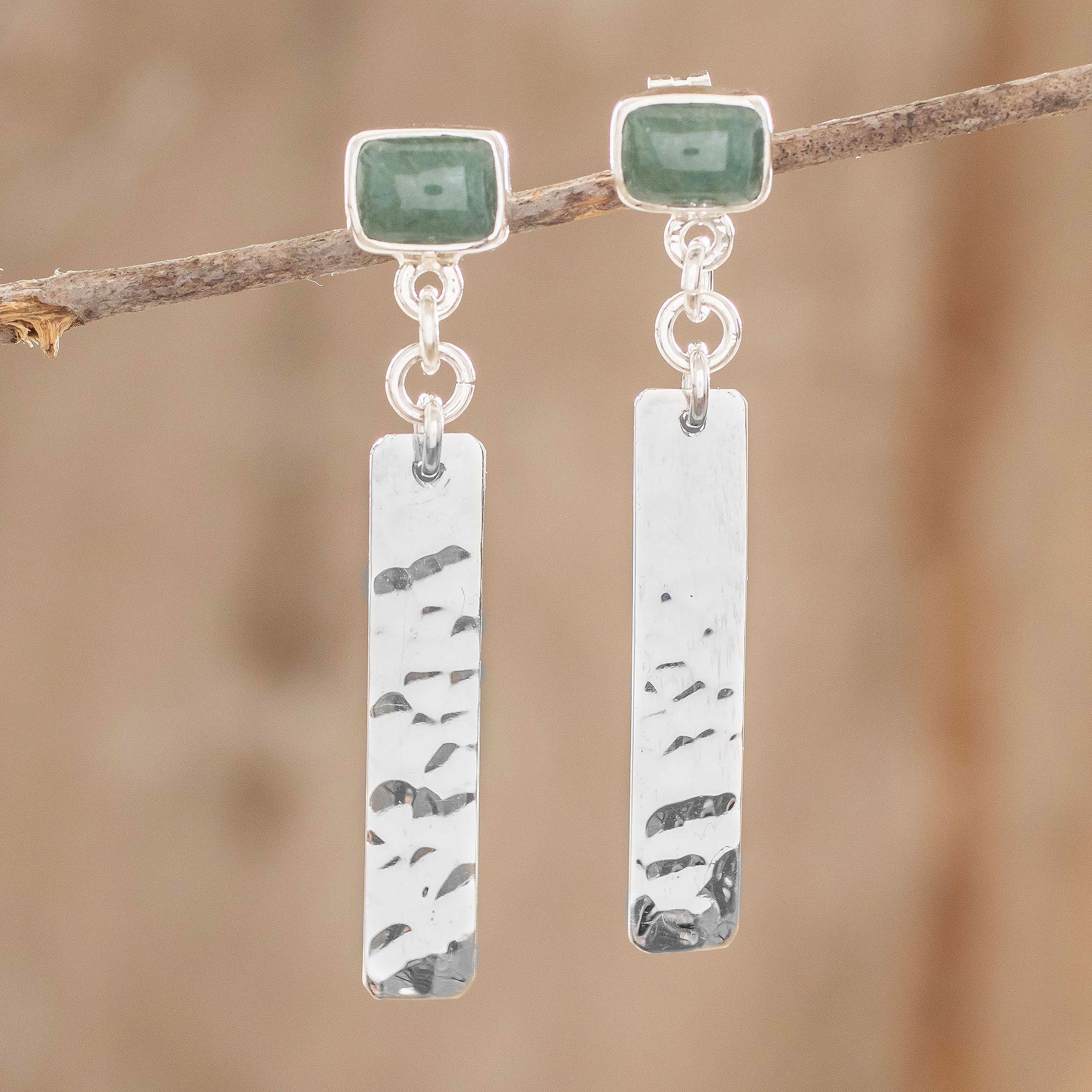 Guatemalan based artist, Carolina Quiroa, designs and crafts these spectacular geometric jade dangle earrings. Finished with a hammered style and butterfly clasps, these earrings will accentuate any style.
