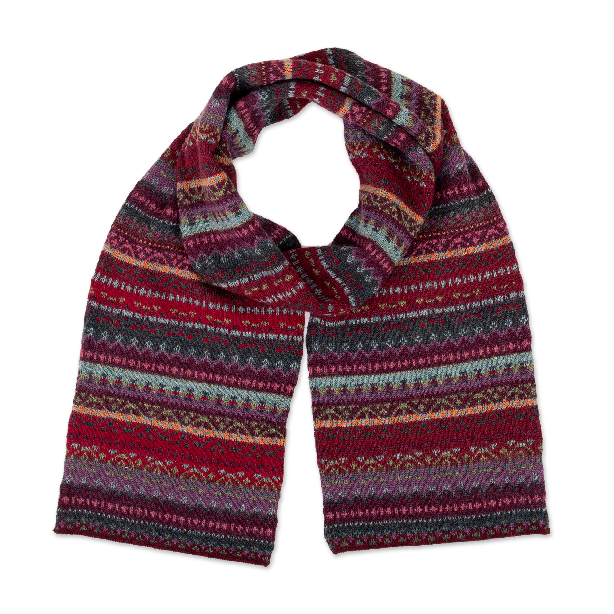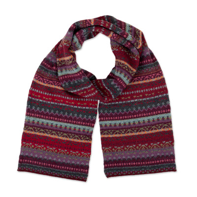 Geometric Knit Baby Alpaca Scarf in Wine Red Purple Hues, 'Andean Mirage'