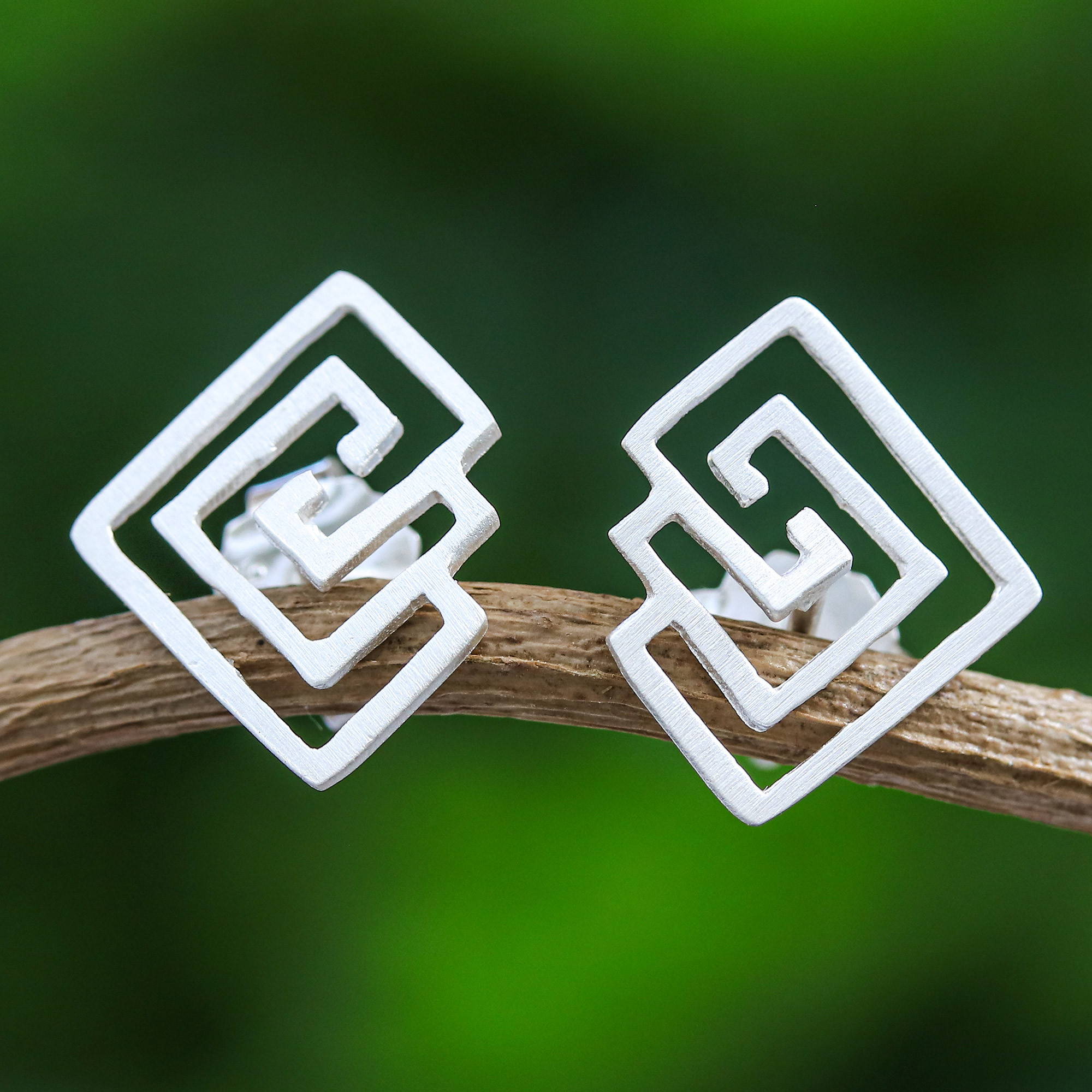Entrance your friends with this mesmerizing pair of stud earrings from Thailand. Designed by Jantana, each earring is crafted of sterling silver with a brushed-satin finish, resulting in geometric maze-like openwork.
