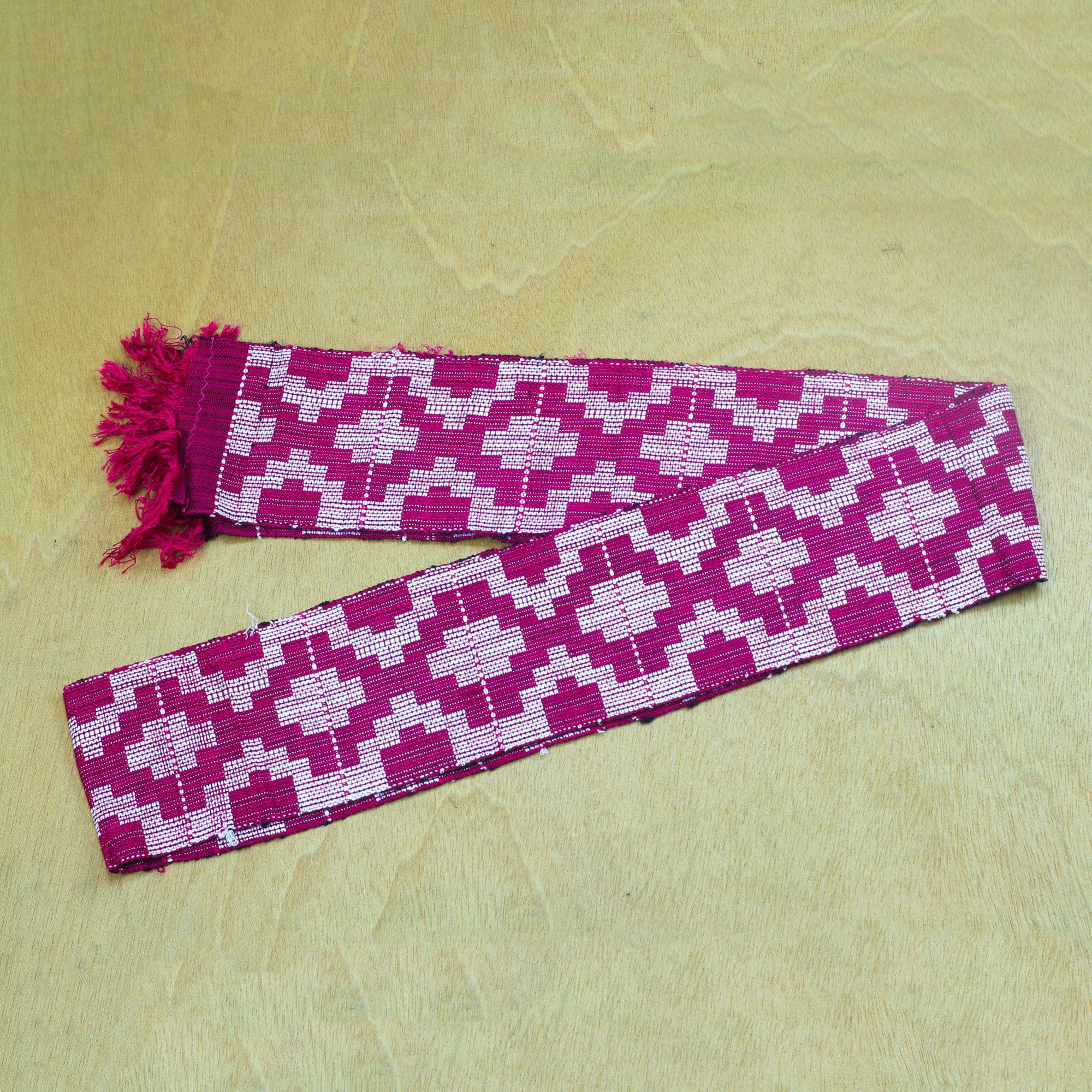 Fit for royalty, this traditional kente scarf combines mulberry and white to create geometric patterns. Ghana's Akoma of West Africa creates this fringed scarf, which is woven by hand.