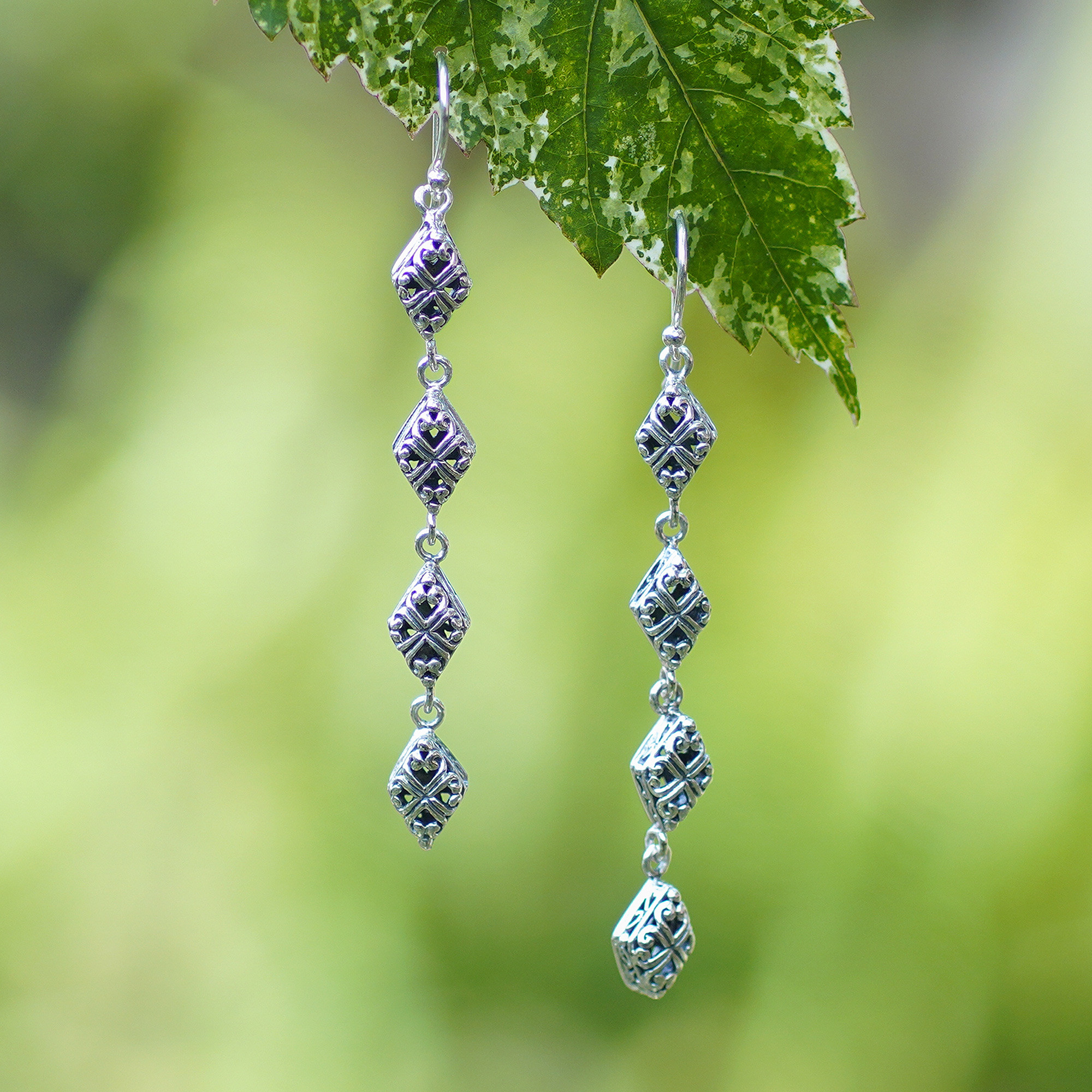 Elegantly cascading rhombuses form a captivating geometric dance in these sterling silver dangle earrings where light plays across each angled surface to create dynamic sparkle with every movement. Designed by Balinese artisan Ketut Udiana, their contemporary silhouette brings architectural precision to your jewelry collection, offering a versatile accessory that transitions effortlessly from daytime meetings to evening gatherings.