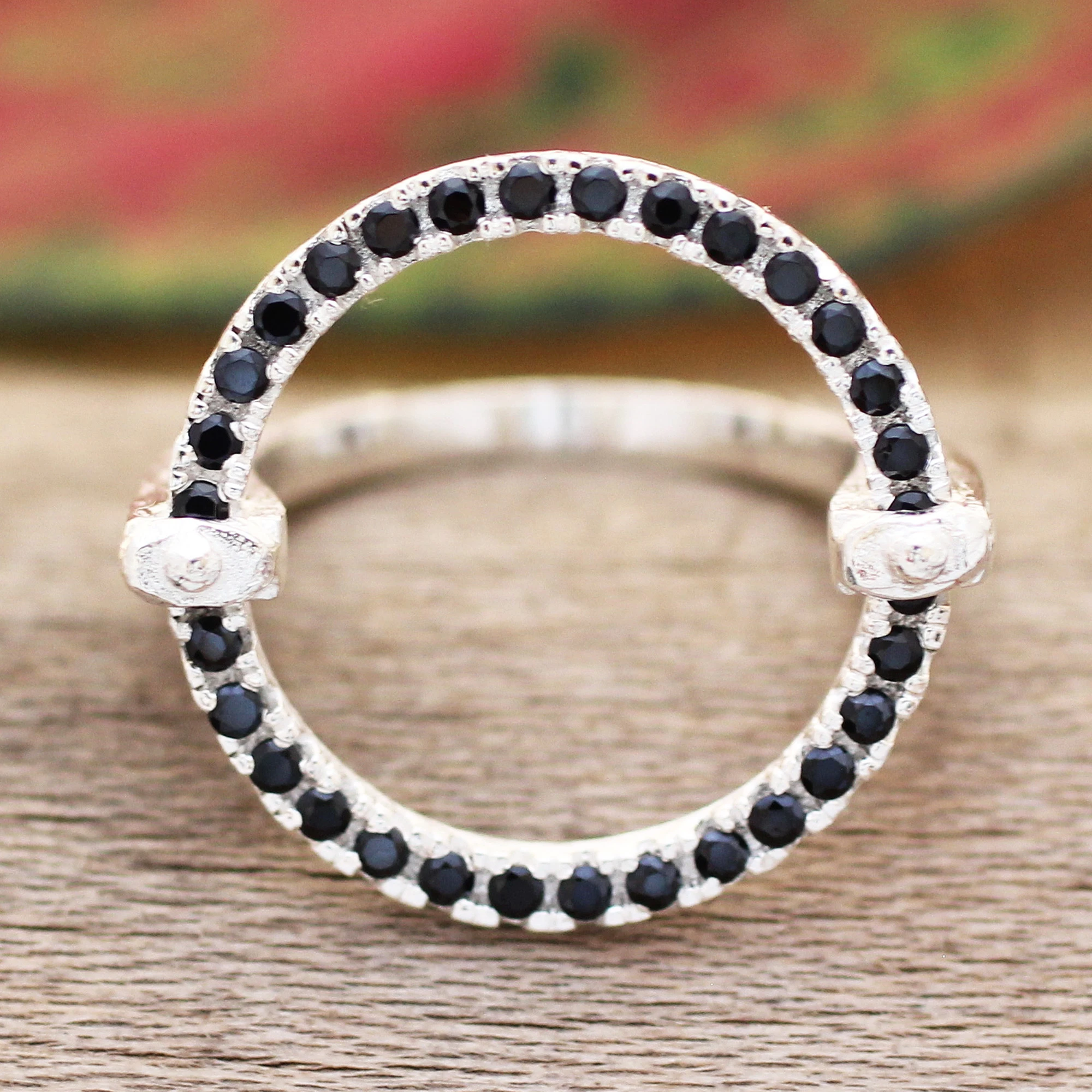 Little spinel beads go all over a mystic design crafted in India. Designed by Shivani Choudhary, this sterling silver cocktail ring comes in a high polish finish and features a round structure at the front, displaying the black jewels in all their beauty. The gems are also associated with peace and unity, helping people put their differences aside.