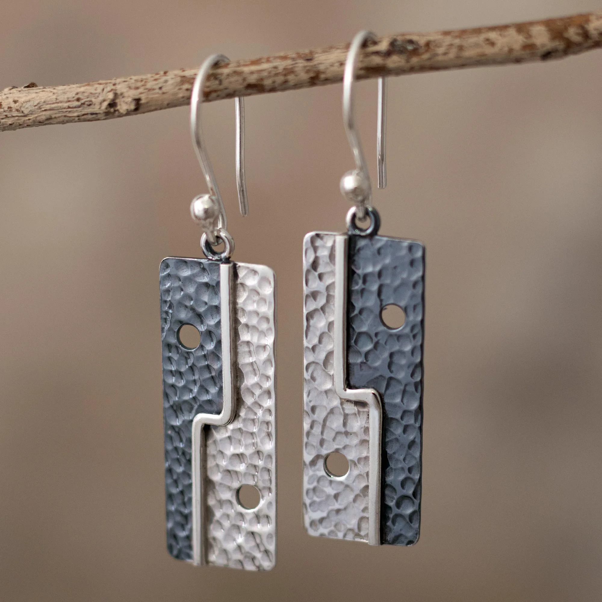 These captivating dangle earrings are the design and creation of Peruvian artisan Zaida Lanning. She hand crafts two rectangles from sterling silver and combines an oxidized and high polish finish with a hammered style to create a contrast that will catch everyone's attention.
