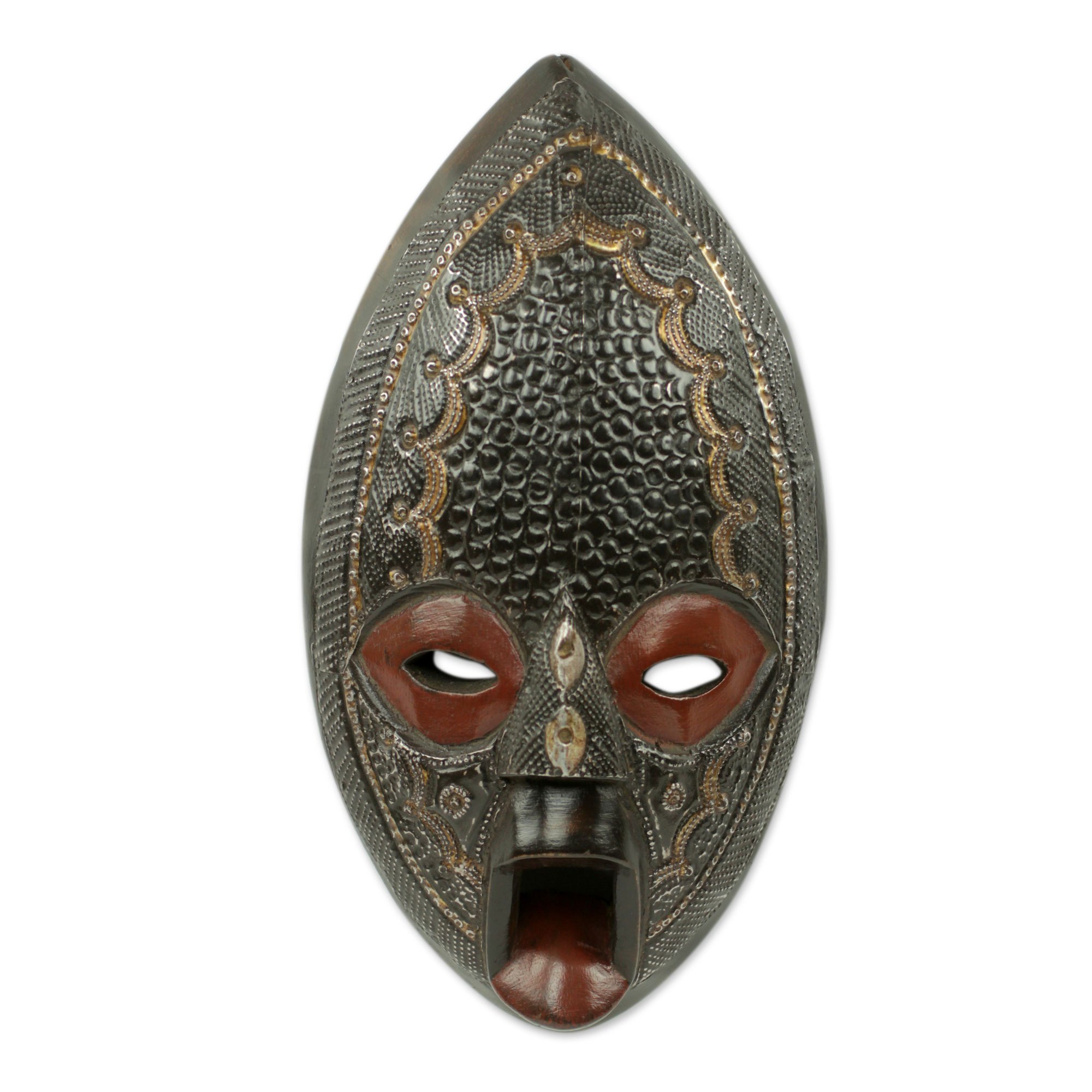 Abdul Aziz Mohamadu carves a beautiful African mask of his own design. Richly textured, it is covered with sheets of hand-embossed aluminum. The visage opens his mouth to pronounce a solemn blessing on the area where the mask is displayed. The artisan names this piece adom ara kwa, meaning "only by grace" in the Akan language.
