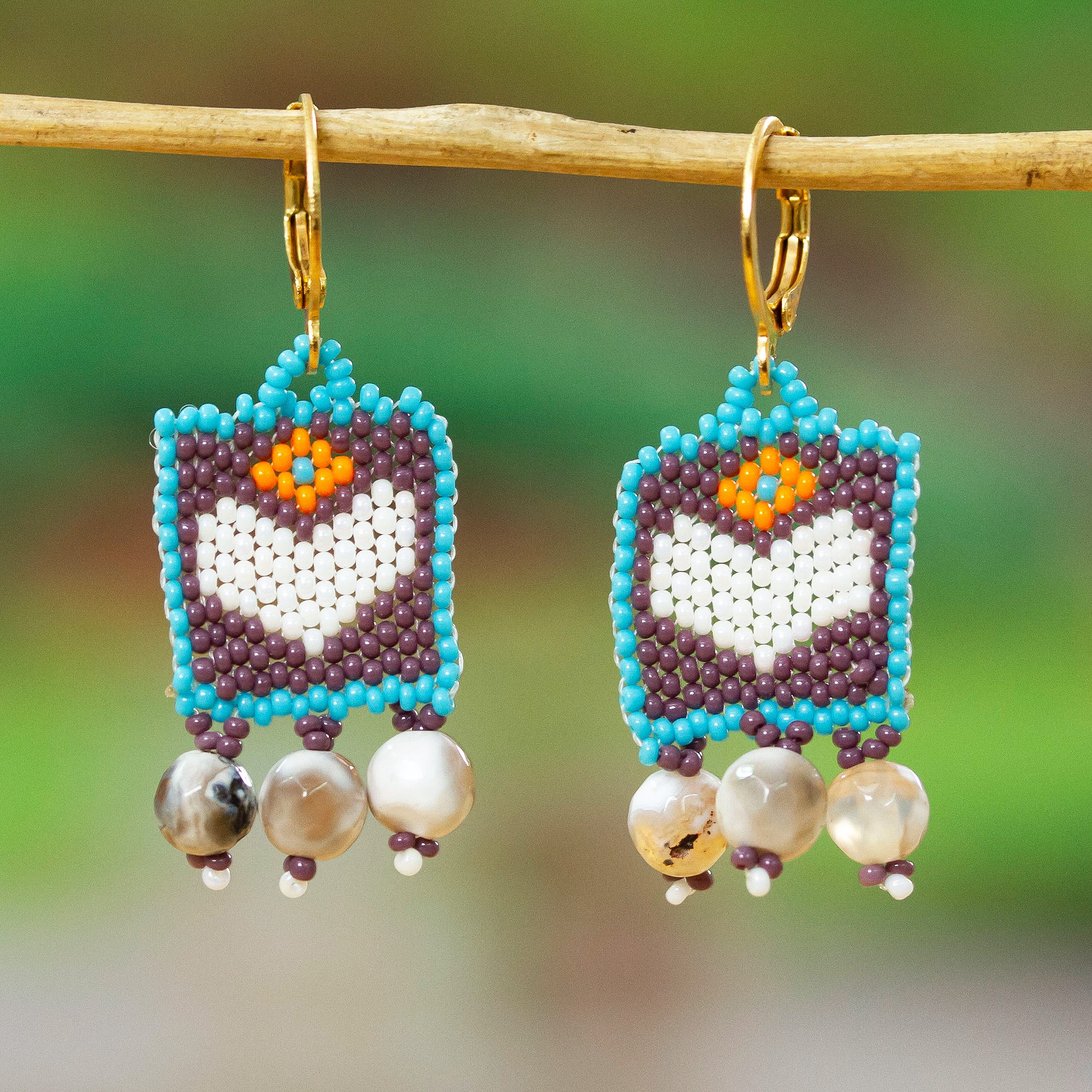 Ethereal spheres of agate dance at the bottom of this lovely pair, made for those with a heart for enchantment. Artisan Ana Mirez combines purple, blue and white hues in these glass beaded dangle earrings—each hanging from 14k gold-plated brass lever-back clasps.