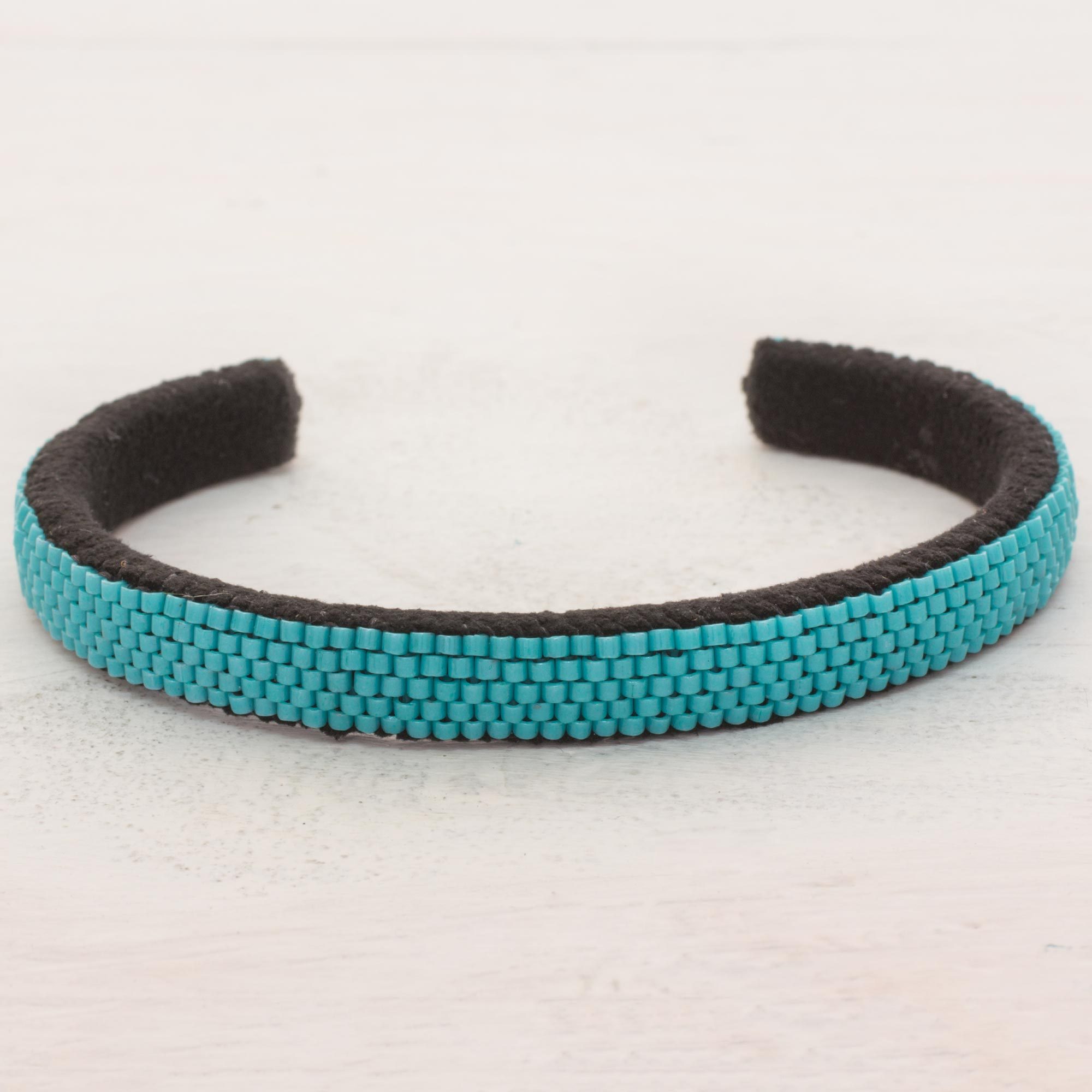 Featuring cerulean blue glass beads along the band, this cuff bracelet comes from El Salvadoran artisans in Pearls of the Sea Youth Group. Each bracelet is crafted by youth near the city of San Salvador who hope to achieve a better education.