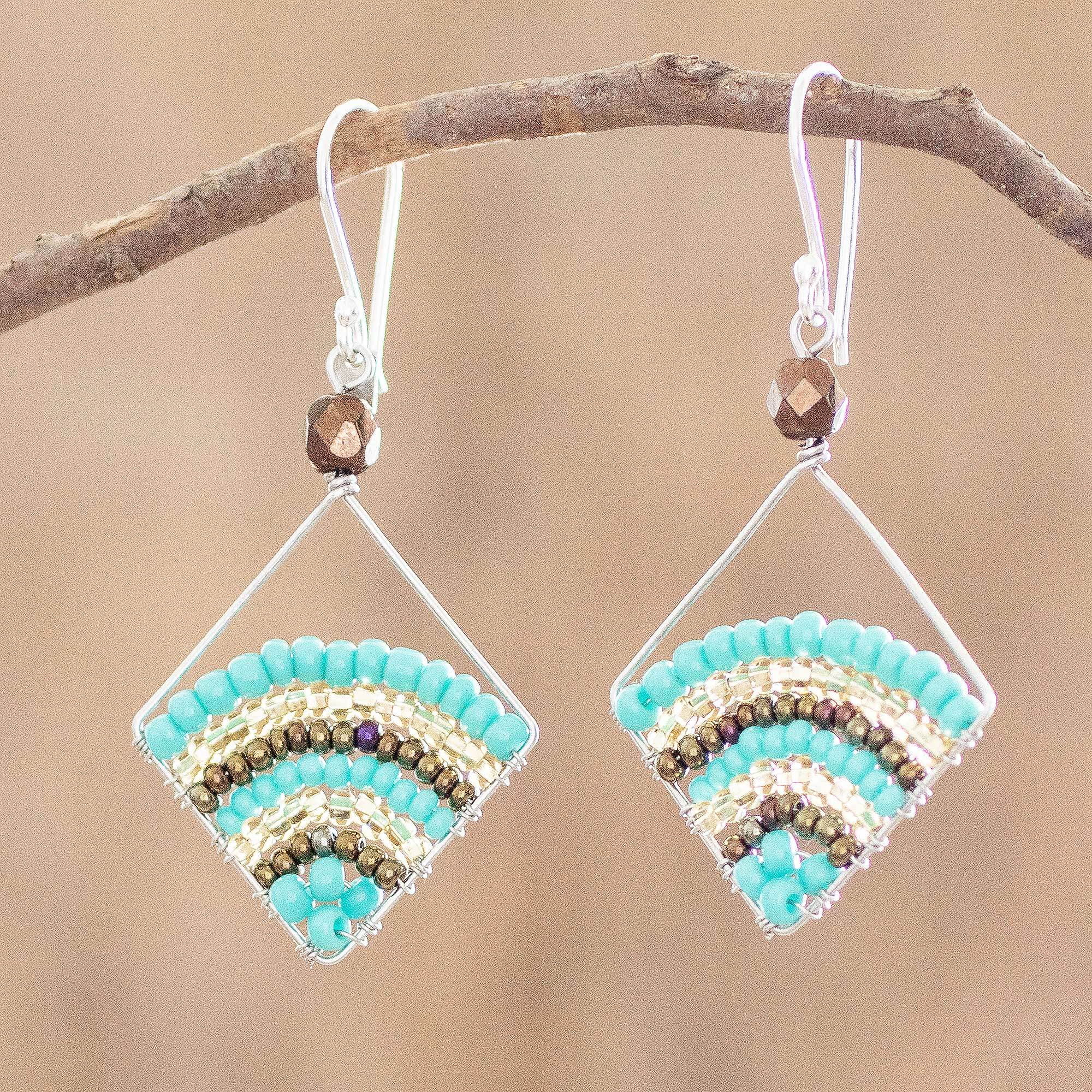 As a young child, Domingo Reanda found he had more of an affinity for his family's weaving than farming. His talents also lie with "weaving" wire and coloring them with fine beads. These earrings feature two diamond shaped stainless steel frames with arches of glass and crystal beads that hang from sterling silver hooks.