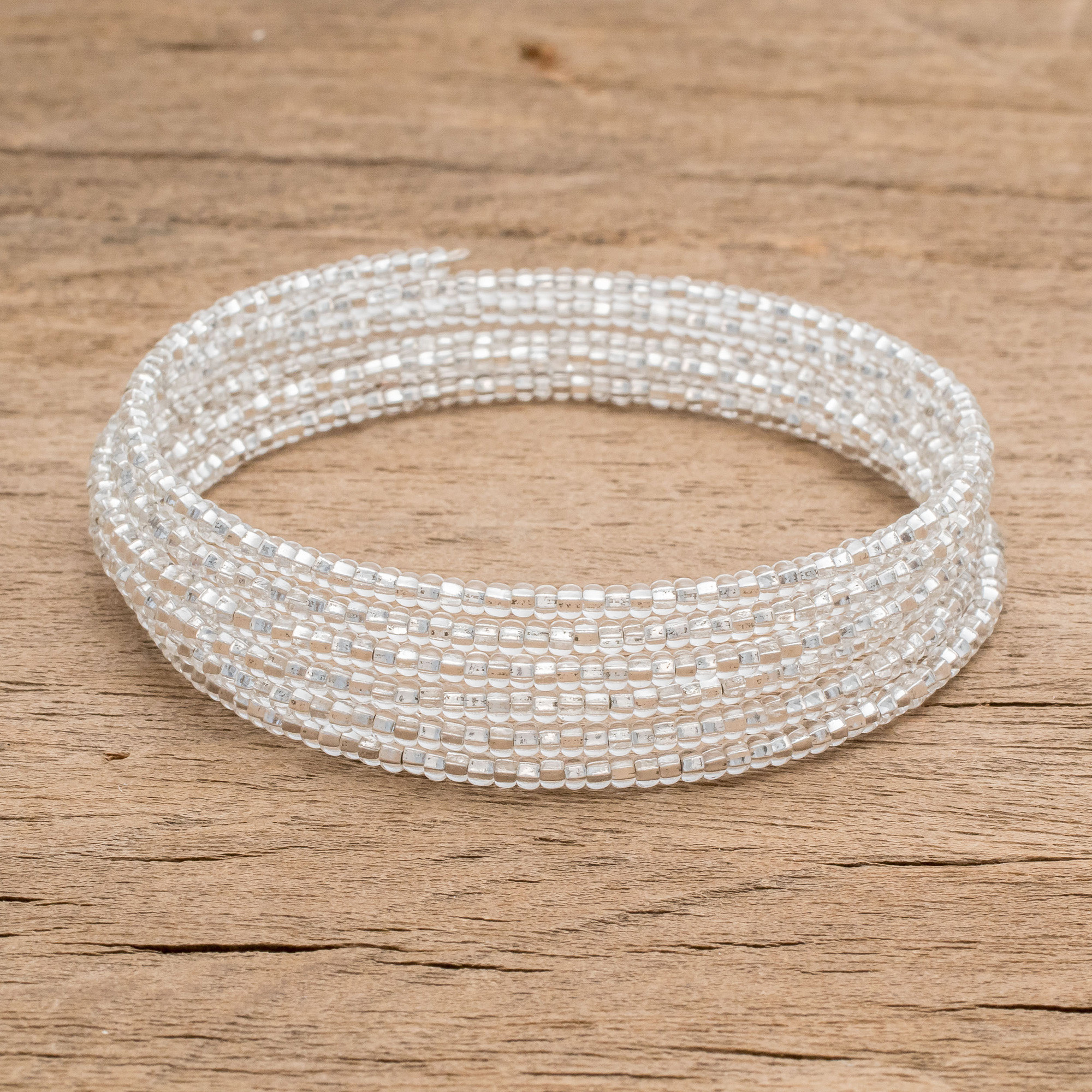 Evoking the brilliance of the moon, this wrap bracelet is created by Guatemalan artisan Mirian Zet. She selects petite beads of clear glass that circle the wrist several times.