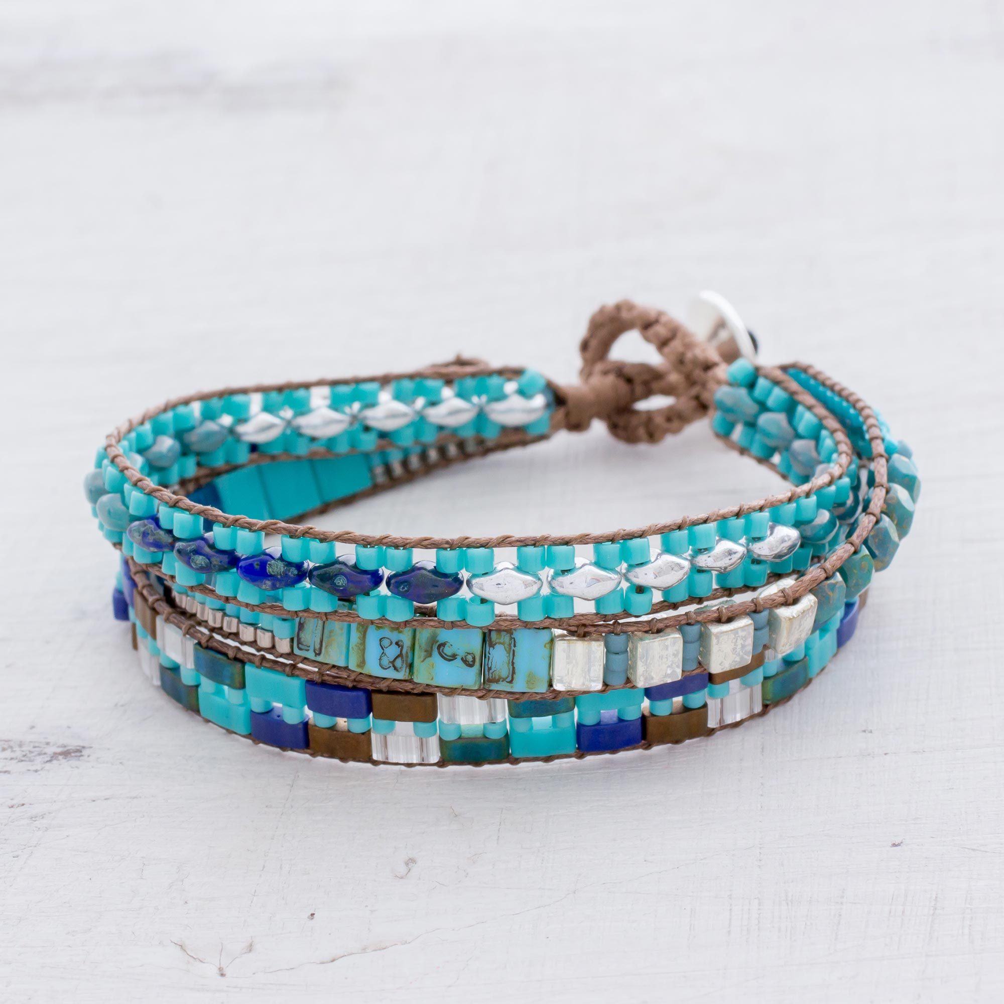 Evoking the crystalline waters of a mountainside city, this fascinating wristband bracelet is designed by Guatemalan artisan Cristobal Ramirez. Several lengths of nylon cord circle the wrist, strung by hand with an array of blue and turquoise-colored beads. The bracelet closes with a pewter button.