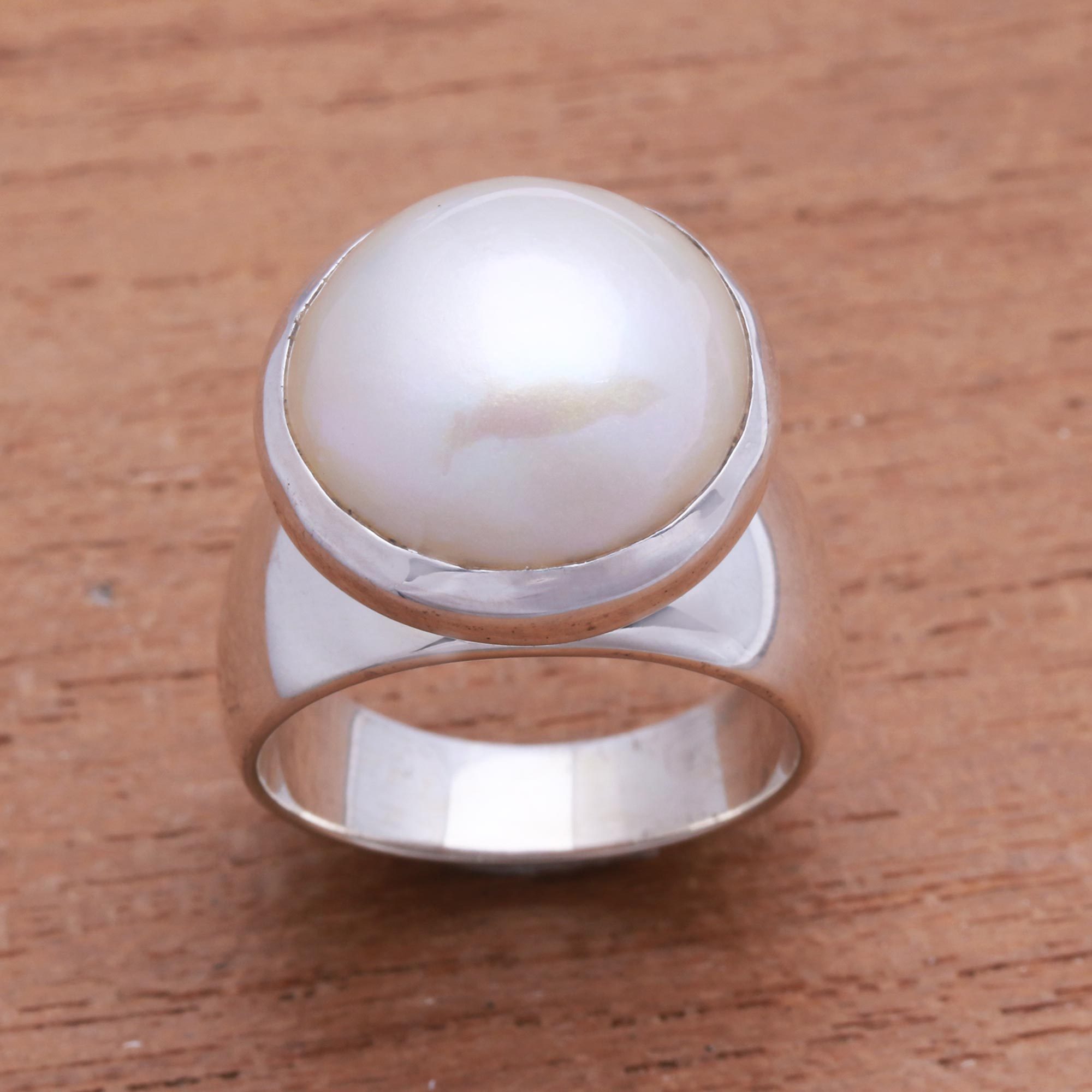 Cradled by sterling silver, a cultured mabe pearl crowns this cocktail ring from Bali. This ring is presented as part of the Mutiara Collection. It circles the finger with a bold but simple band of sterling silver.