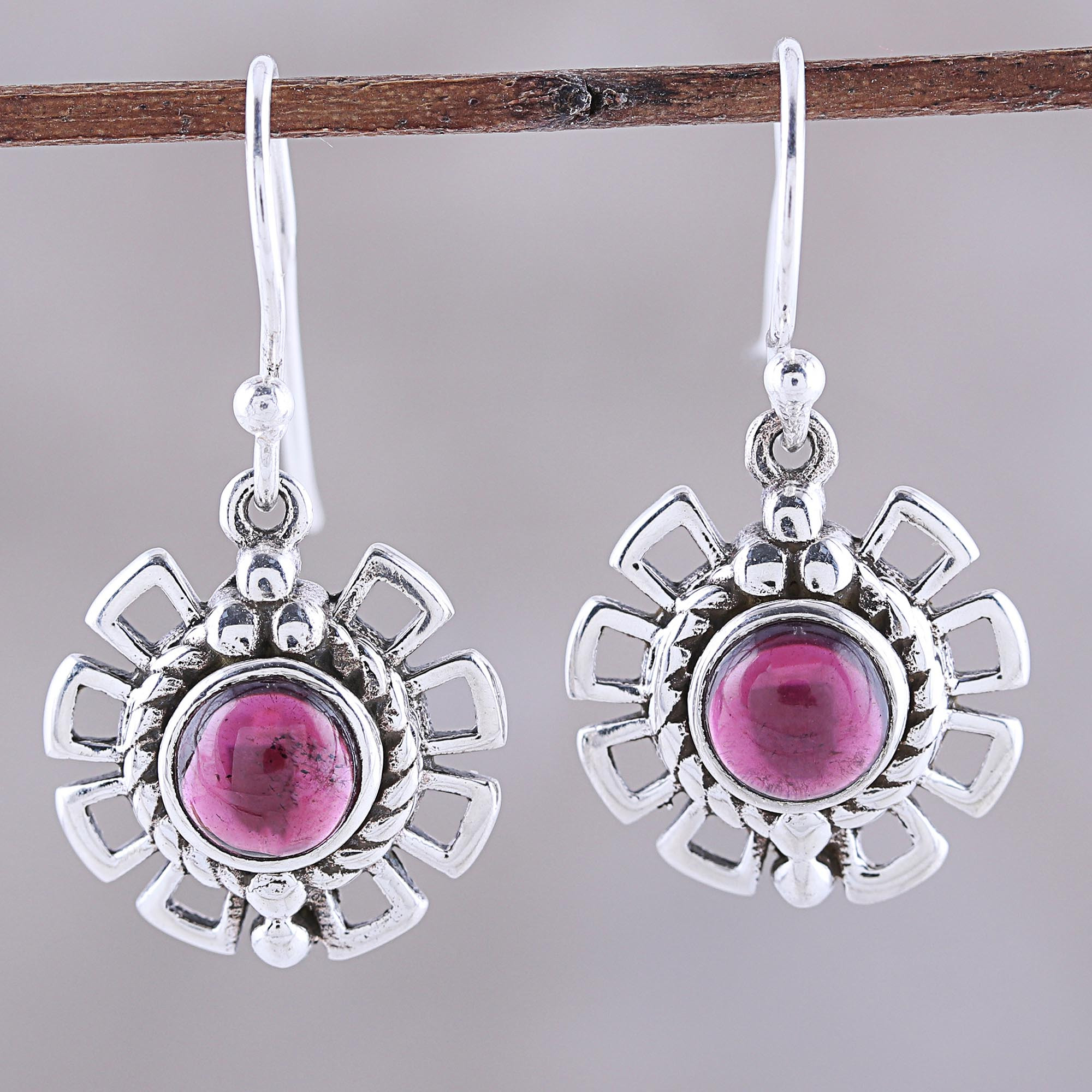 Surrounded by sterling silver petals that gleam with a high-polish finish, two cabochons of natural garnet are featured in this pair of dangle earrings from India. Alok Jain works with local artisans to present this wonderful accessory.