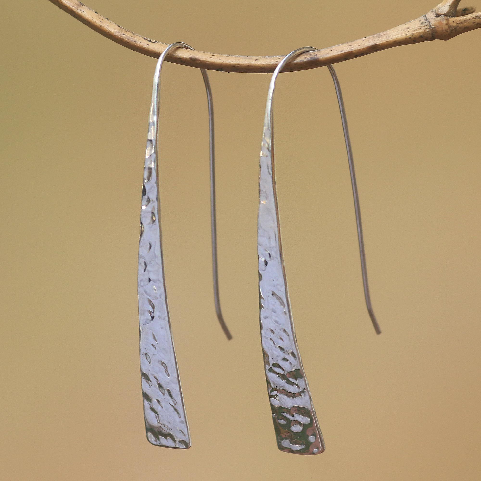 For a contemporary accessory, Balinese artisan Made Mustika designs this pair of drop earrings. He handcrafts the earrings of sterling silver, featuring bladed shapes that fall below the ears. Each earring is accentuated by a combination of finishes that resemble ocean waves.