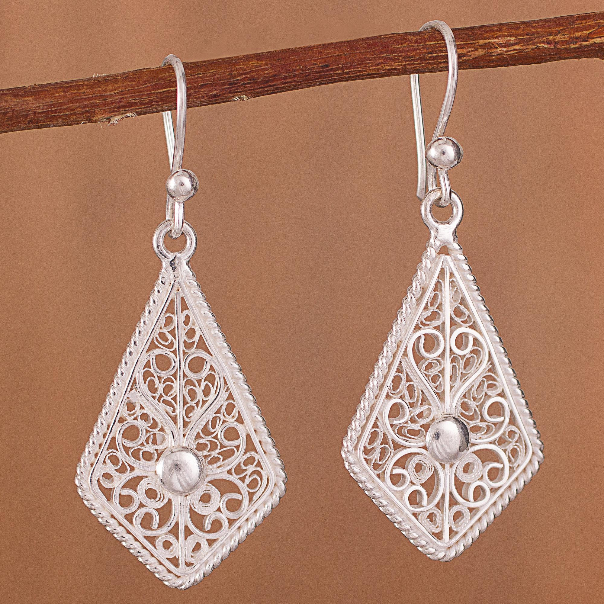 Gleaming Sterling Silver Filigree Kite Dangle Earrings, 'Gleaming Royal Scroll'