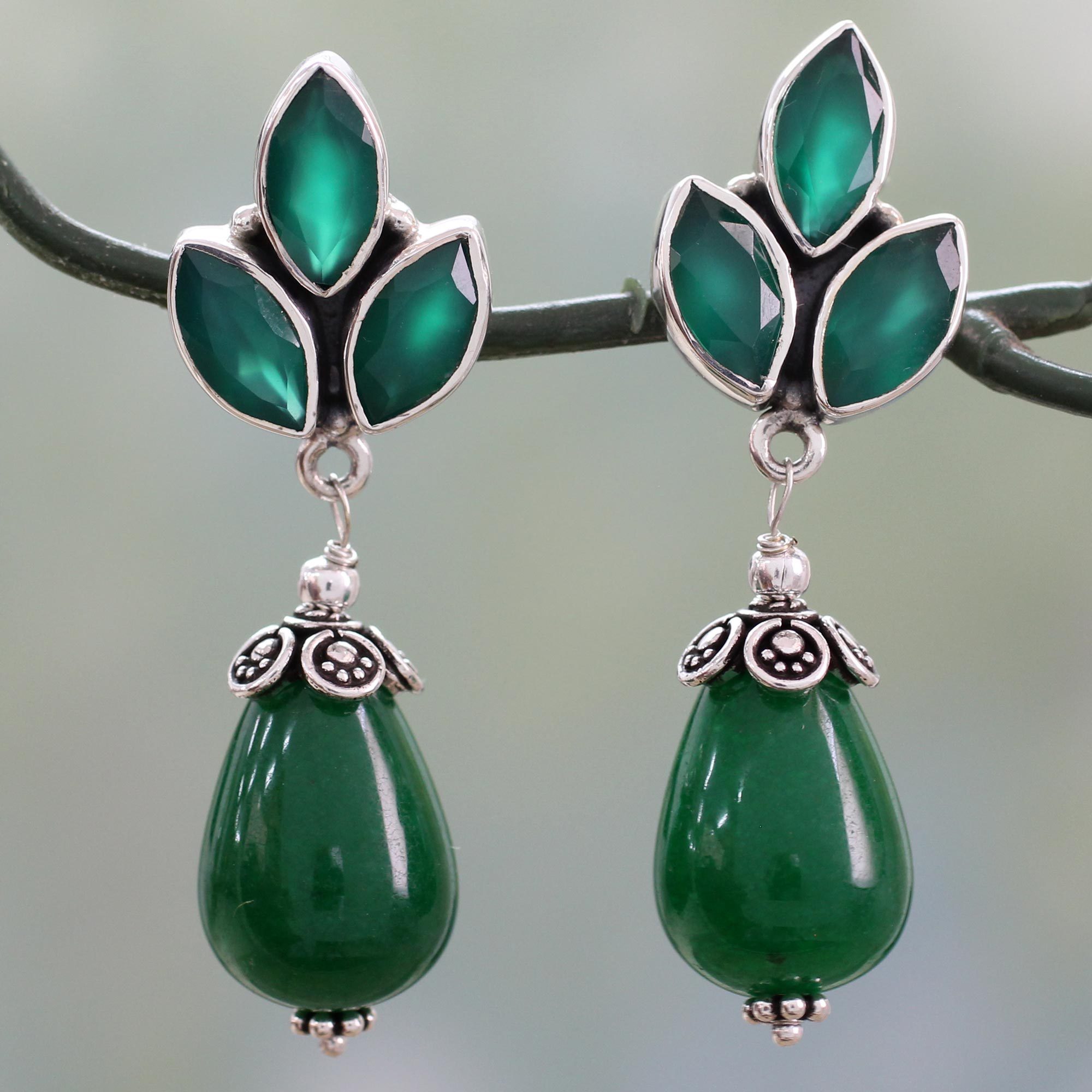 Exquisitely beautiful, these artisan crafted earrings come from India's Neeru Goel. The sterling silver earrings feature glossy dyed green onyx leaves and dyed green chalcedony in a harmonious contrast of colors.