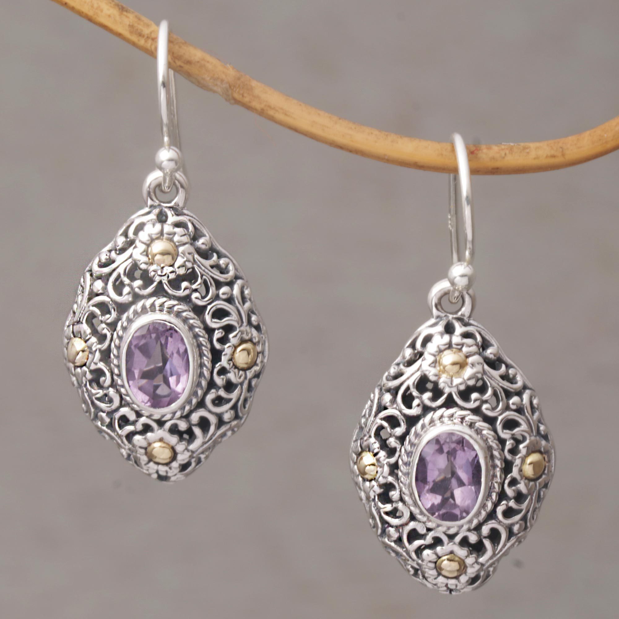 Gold Accent Amethyst Floral Dangle Earrings from Bali, 'Floral Dew'