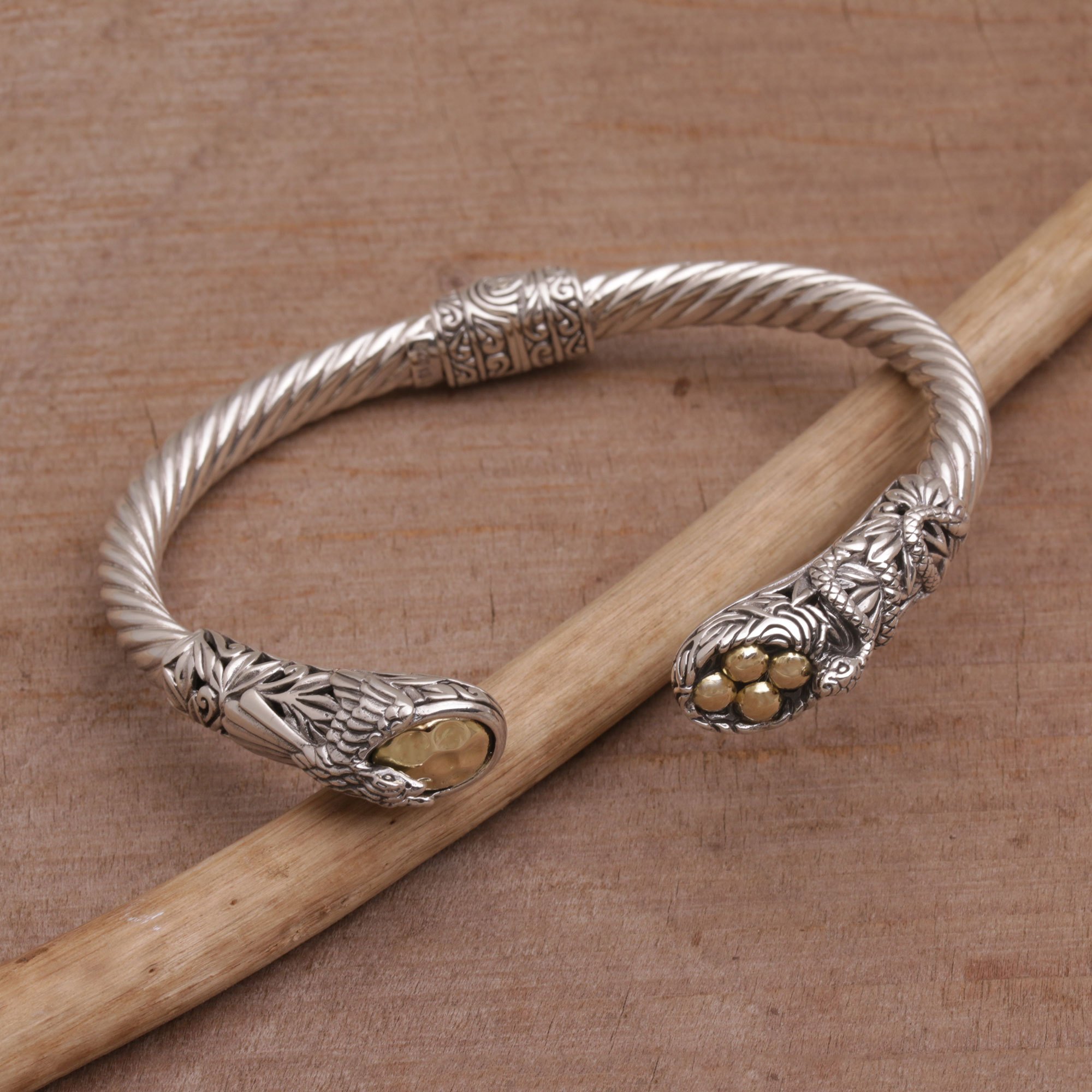 This Balinese accessory embodies the survivalist elements of nature. Crafted of sterling silver, the bracelet features an eagle at one end that swoops in to guard her 18k gold plated eggs from a thieving snake. Circling the wrist with rope patterns, this truly eye-catching accessory is presented by Kadek Wijanegara. A concealed hinge at the center allows the bracelet to fit the wrist.