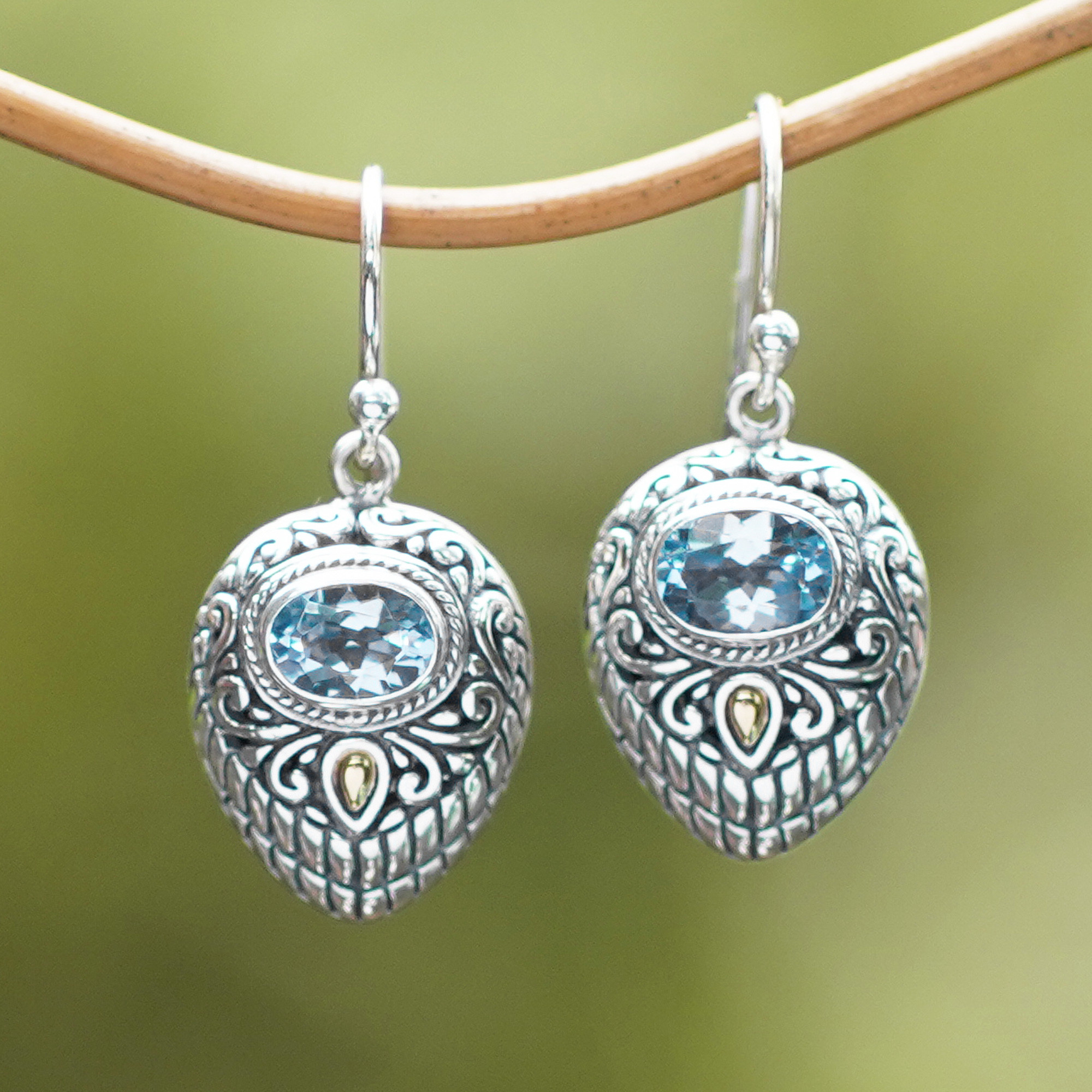 Two crests are crafted in sterling silver with intricate swirling motifs, dangling from the ears with elegance in this pair of Balinese earrings. Passionate about the handicrafts of his country, Kadek Wijanegara presents the earrings. They are finished with petite 18k gold accents below one carat of faceted blue topaz stones.