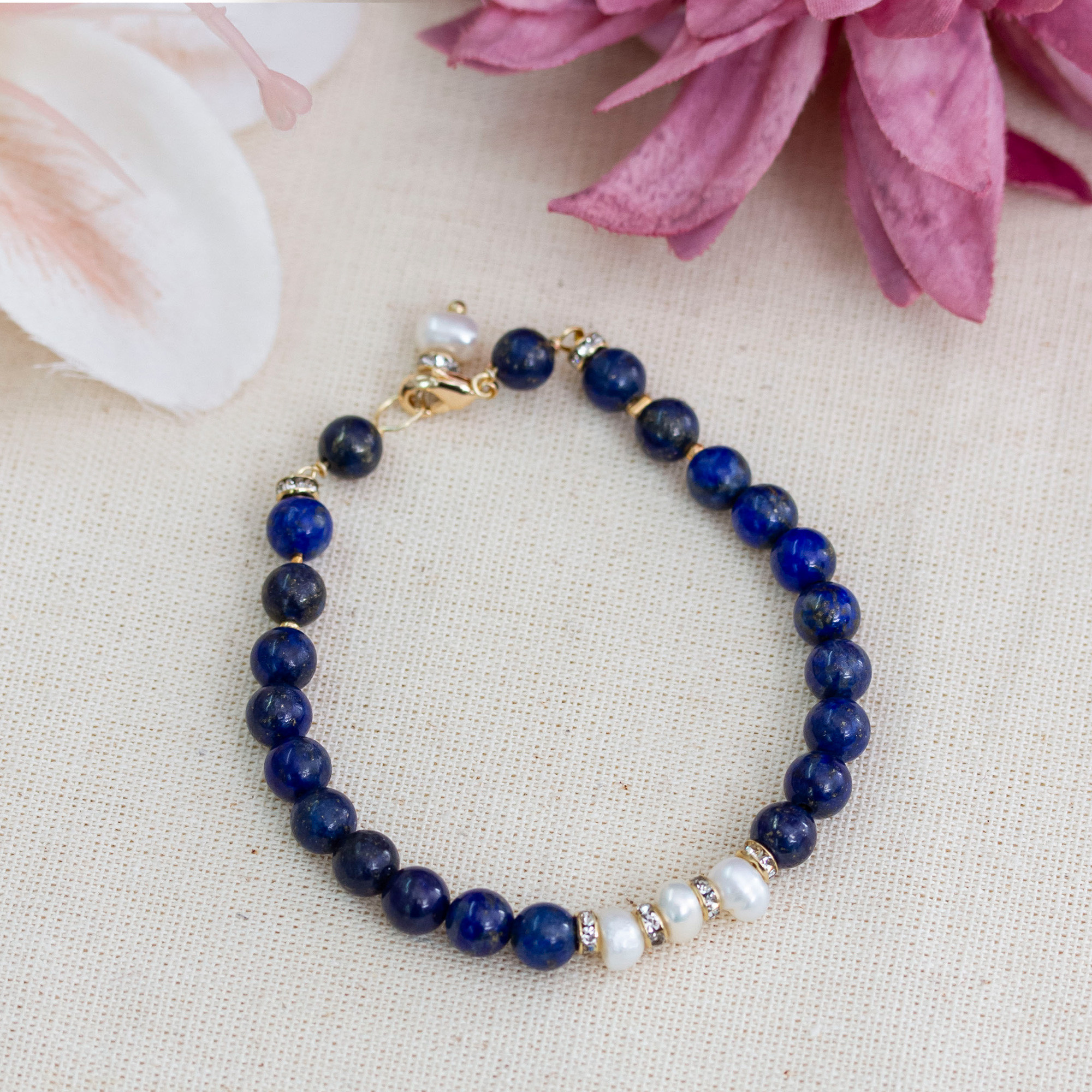 Three cultured freshwater pearls shine like moons in the night amidst dark blue round lapis lazuli in this beaded pendant bracelet. Handcrafted by Mexican artisan Patricia Guzman, the bracelet also has a dangling cultured pearl and spacer beads set with sparkling crystal. The bracelet findings are 14k gold plated stainless steel.