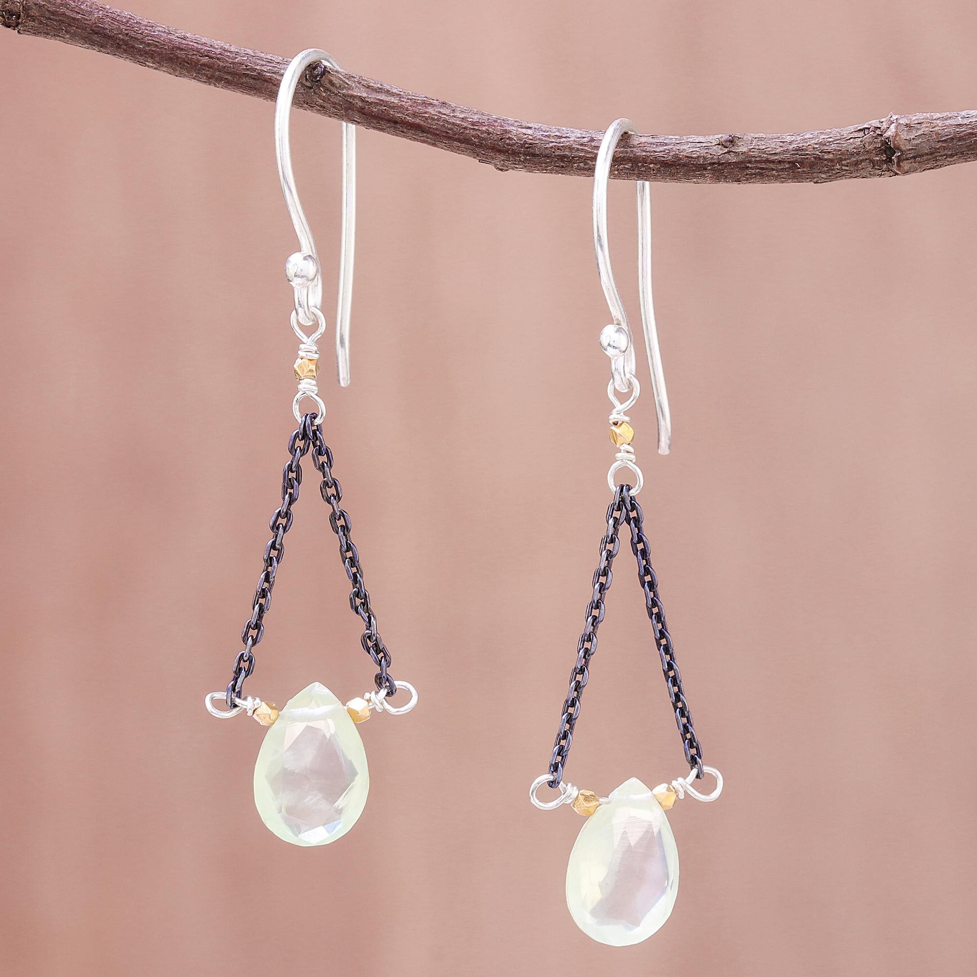 Ethereal pale green prehnite briolettes swing from dangle earrings that resemble the scales held by Lady Justice. Khun Boom in Thailand creates intriguing contrasts by juxtaposing oxidized sterling silver chain with gleaming 24k gold plated accents and polished sterling hooks. The gemstones total 2.5 carats.