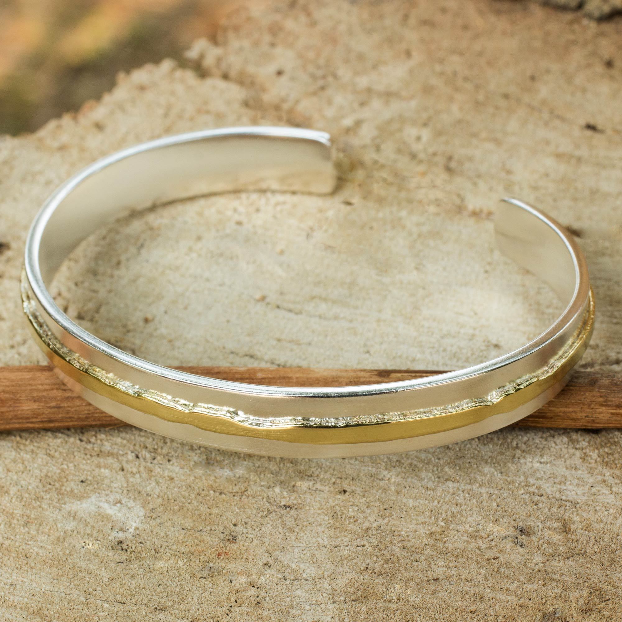 A golden ripple illuminates the design of this Thai cuff bracelet from Wittaya Cheunjit. The sterling silver bracelet is crafted by hand featuring a 24k gold plate accent and a matte finish.