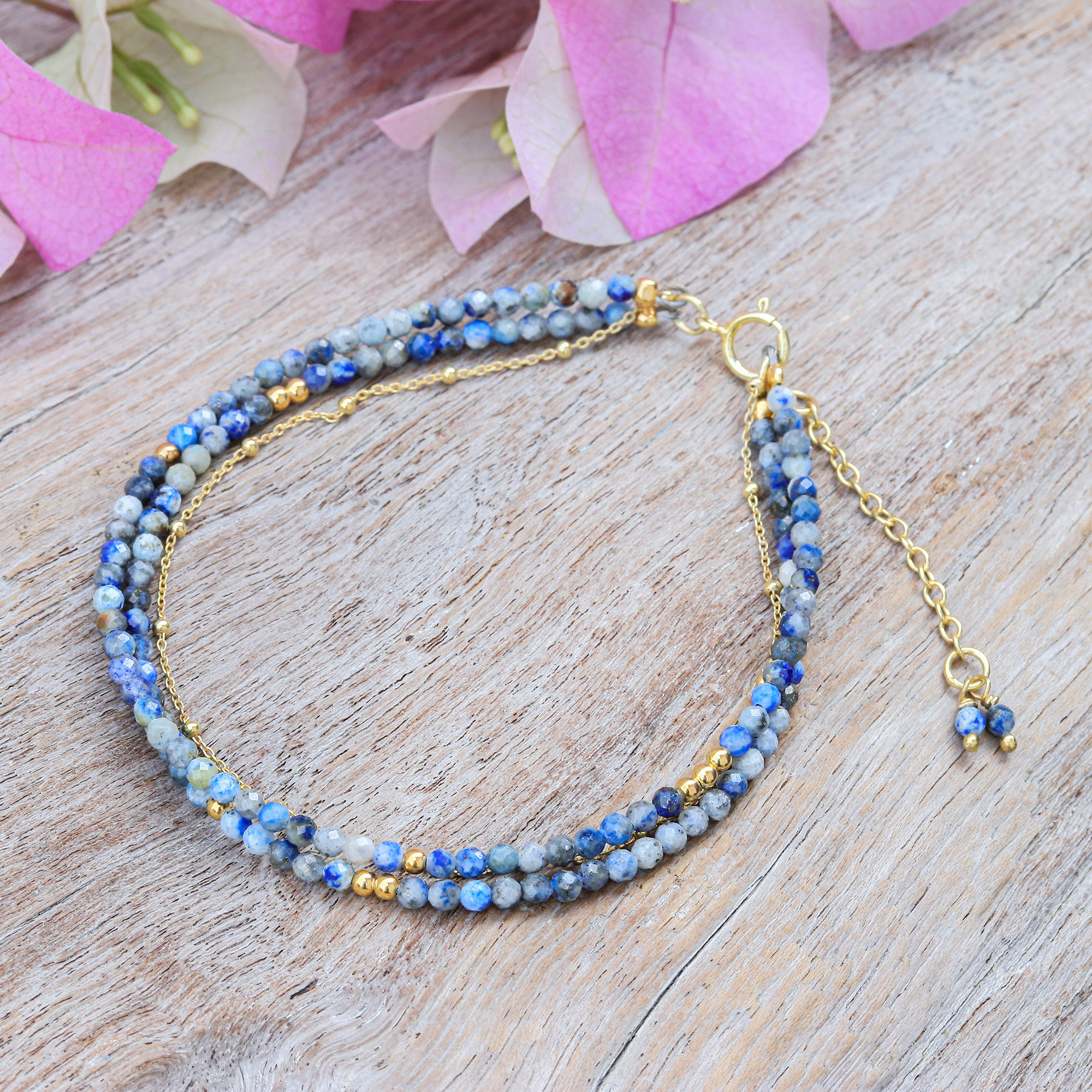 Thailand's Somsiri Juntamin makes a statement of true style with this 24k gold-accented three-strand bracelet. Stones of faceted lapis lazuli—totaling five carats—add their blue beauty to this sublime accessory. Crowned with a high-polish finish, the bracelet also has a handy spring ring clasp.
