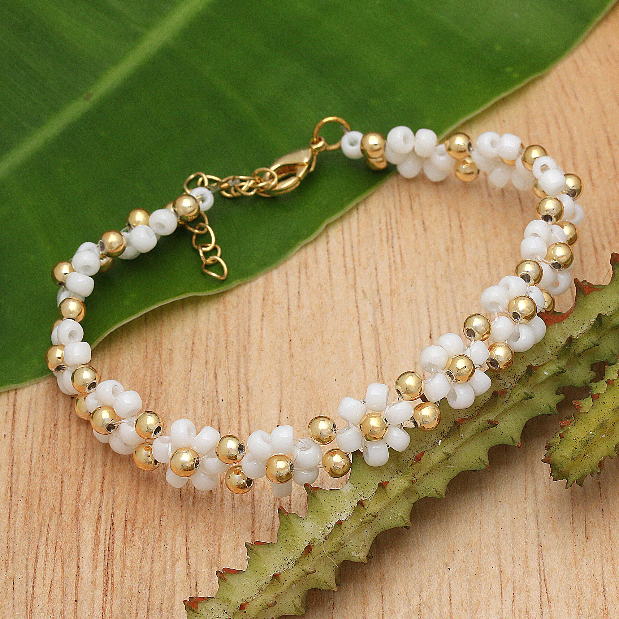 Transform your everyday look into a head-turning ensemble with this sublime floral wristband bracelet. Harmoniously combining petite white glass beads with lustrous 18k gold-plated brass beads, Balinese artisan Ayu Widiani's exceptional creation is adjustable to your liking thanks to the practical extender chain. This lovely accessory will revolutionize your style with a splash of vibrant elegance and sophistication.