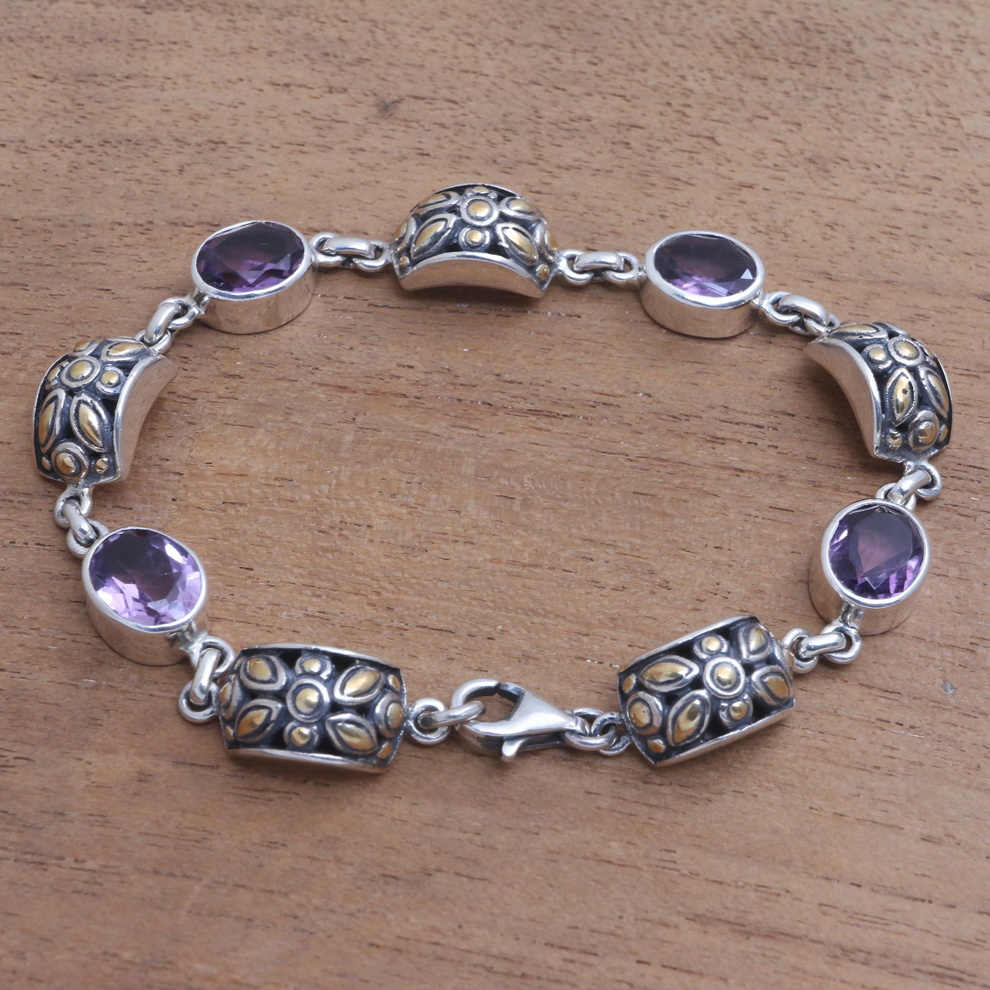 Glistening with purple hues, 9.5 carats of faceted oval amethysts are featured in this bracelet from Bali. Designed by Ni Wayan Astiti, this bracelet circles the wrist with combination-finish sterling silver links, decorated with 22k gold padi, or "rice" patterns.