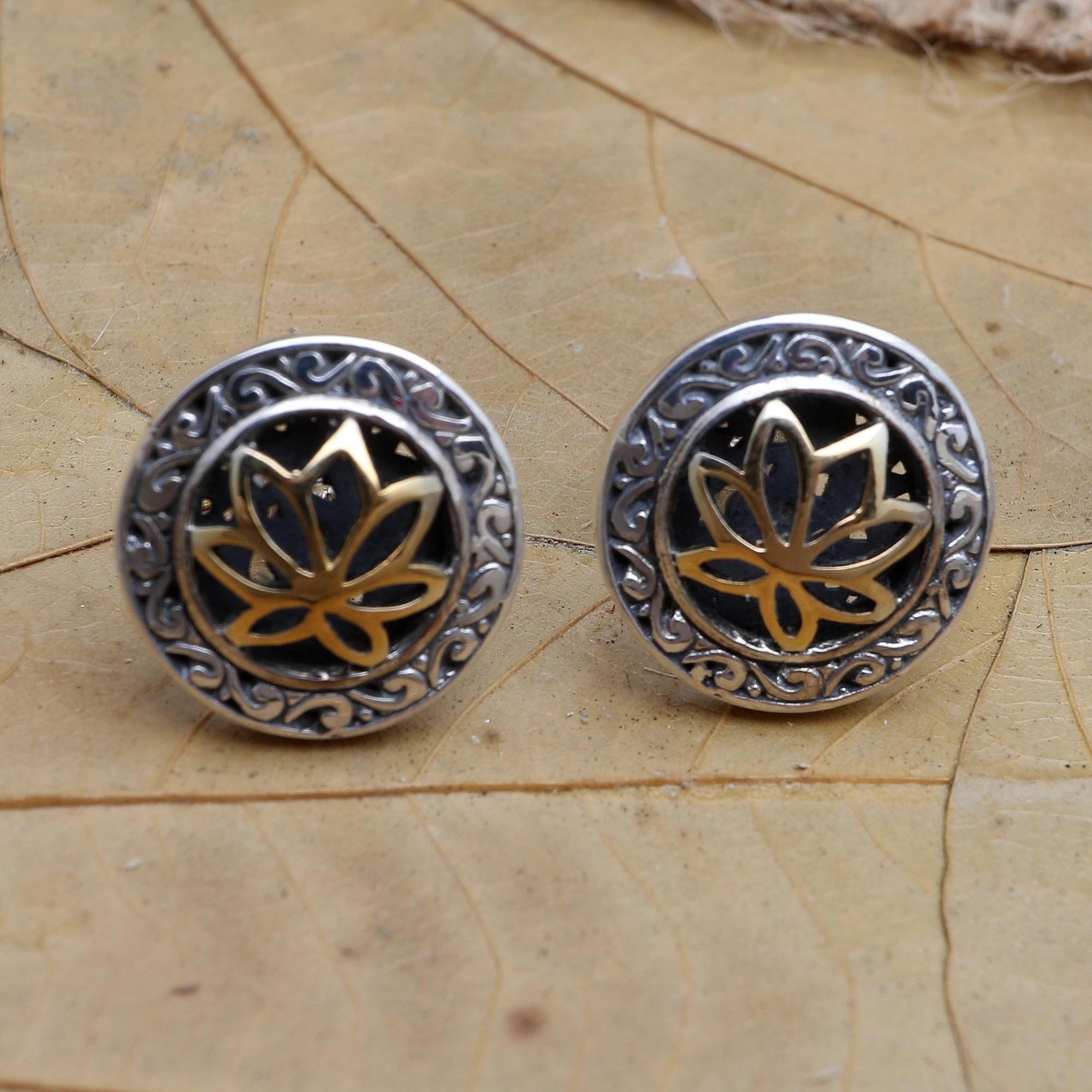 Luxurious gold and cool silver complement one another perfectly in this gorgeous pair of earrings designed by Bali's Ari Gunawan. The artisan centers the round earrings with traditional Balinese designs in 18 gold-plated sterling silver. A sterling silver frame surrounds the tree with oxidized designs.
