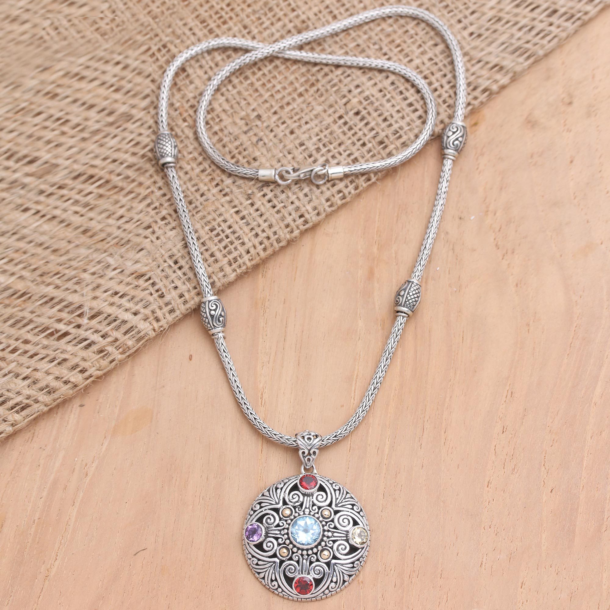 Dewi Putera in Bali designs this gemstone-encrusted pendant necklace with a quartet of shimmering birthstones. The artisan hand crafts the pendant from engraved sterling silver, embellishing the precious metal with blue topaz, amethyst, garnet, and citrine. The pendant swings from a chunky sterling silver naga chain, while 18k gold-plated sterling silver accents add a touch of luxurious shine.