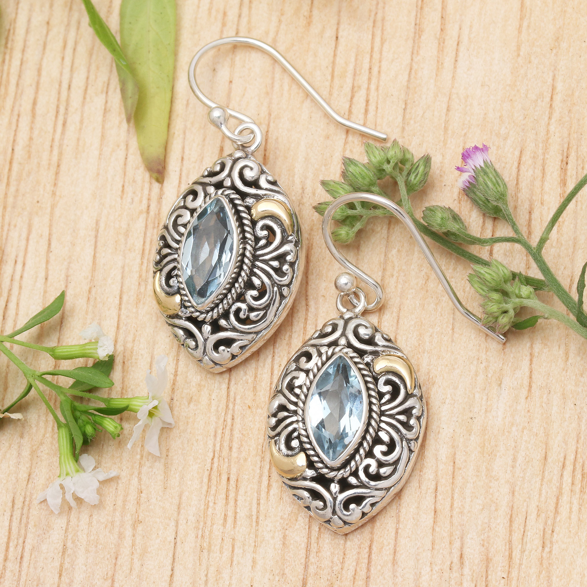 Openwork vine motifs in sterling silver form eye shapes with tasteful 18k gold accents. Bali's Kadek Wijanegara presents these beautiful dangle earrings, centered by two carats of blue topaz stones.