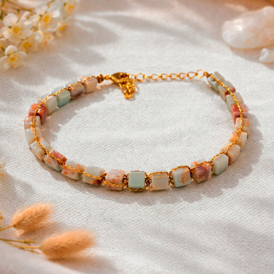 Delicate cubes of jasper float like pastel clouds along a shimmering, golden-hued cord in this exquisite link bracelet that feels both modern and timeless. Each cube-shaped stone tells its own story in soft washes of aqua, blush and beige, their natural patterns as unique as watercolor brushstrokes. The lustrous metallic cord weaves between each bead in an artful knotted technique, creating an elegant rhythm that catches the light with every gesture. Designed by Bali's Ayu Widiani, this bracelet features an 18k gold-plated brass extender chain for a customizable fit, making it perfect for layering with other favorites or wearing solo as a subtle statement.