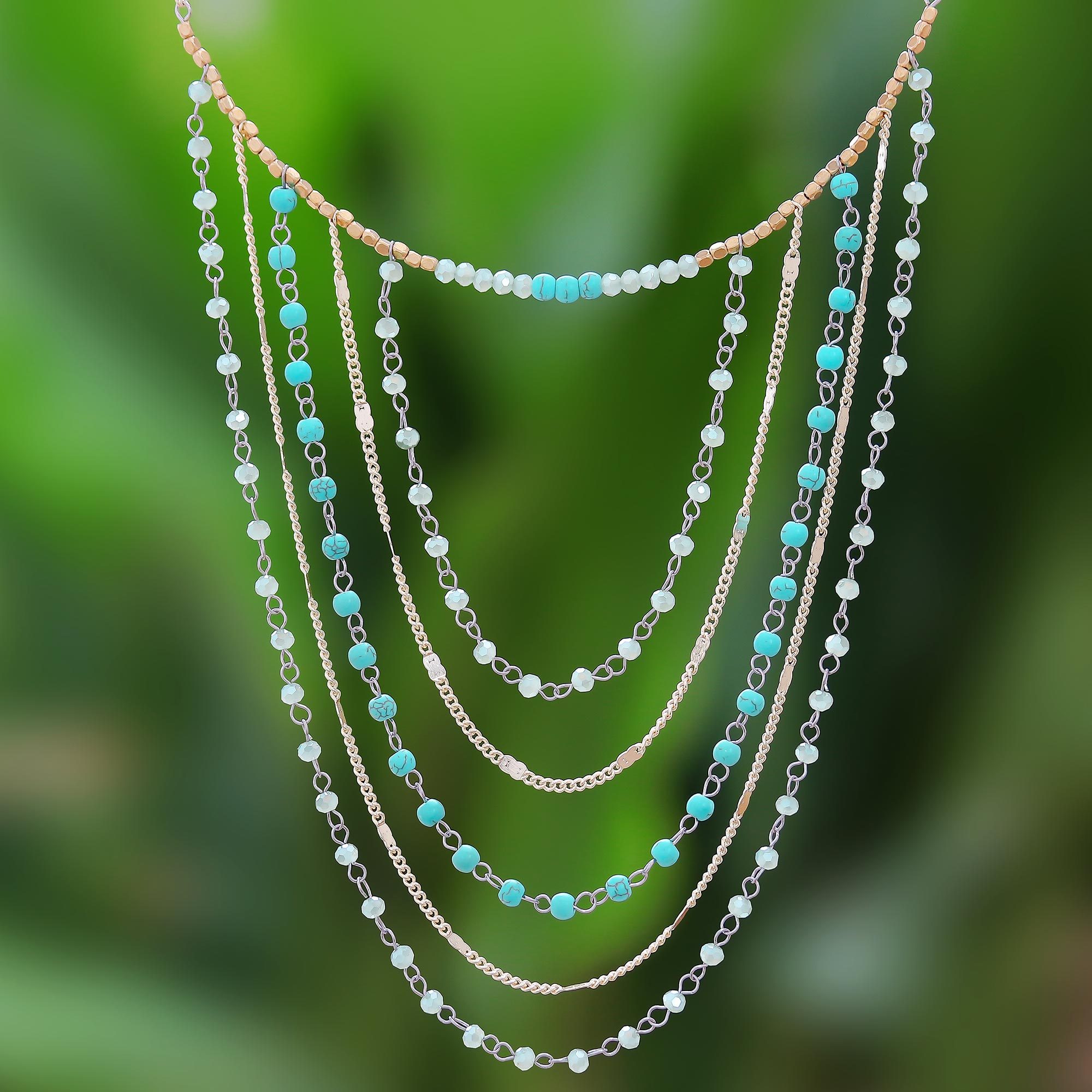Forming the pendant of this necklace, strands of calcite and glass beads on sterling silver links alternate with station chain of sterling silver bathed in 14k gold. Thai artisan Nareerat designs this dreamy necklace, which circled the neck with beads of brass, calcite, and glass.