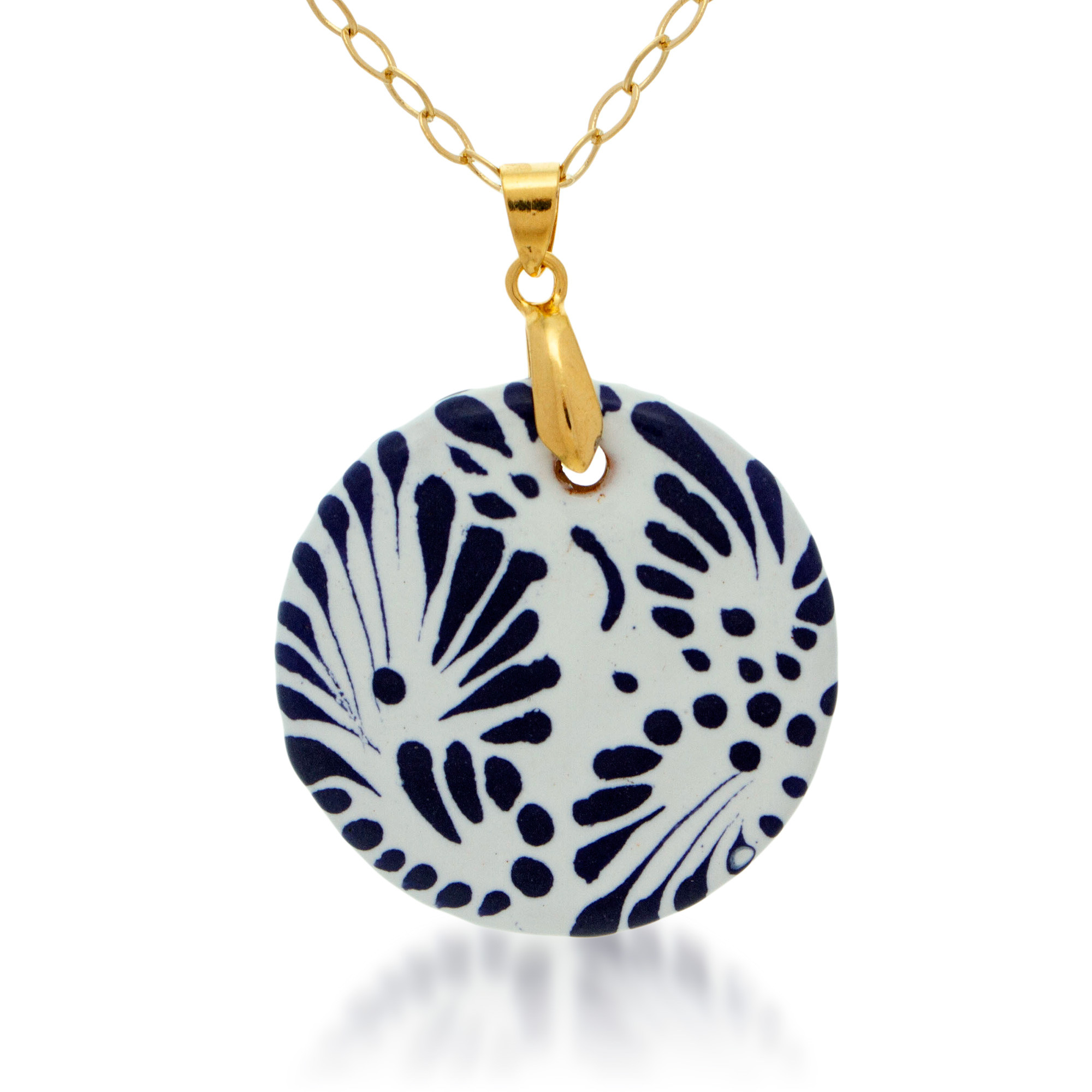 Talavera's classic blue reunites with the golden hue of 10k-plated brass. Mexico's Monica Vazquez honors the region's traditions in this ceramic necklace, whose round pendant evokes a stunning spring of Hacienda vibes.