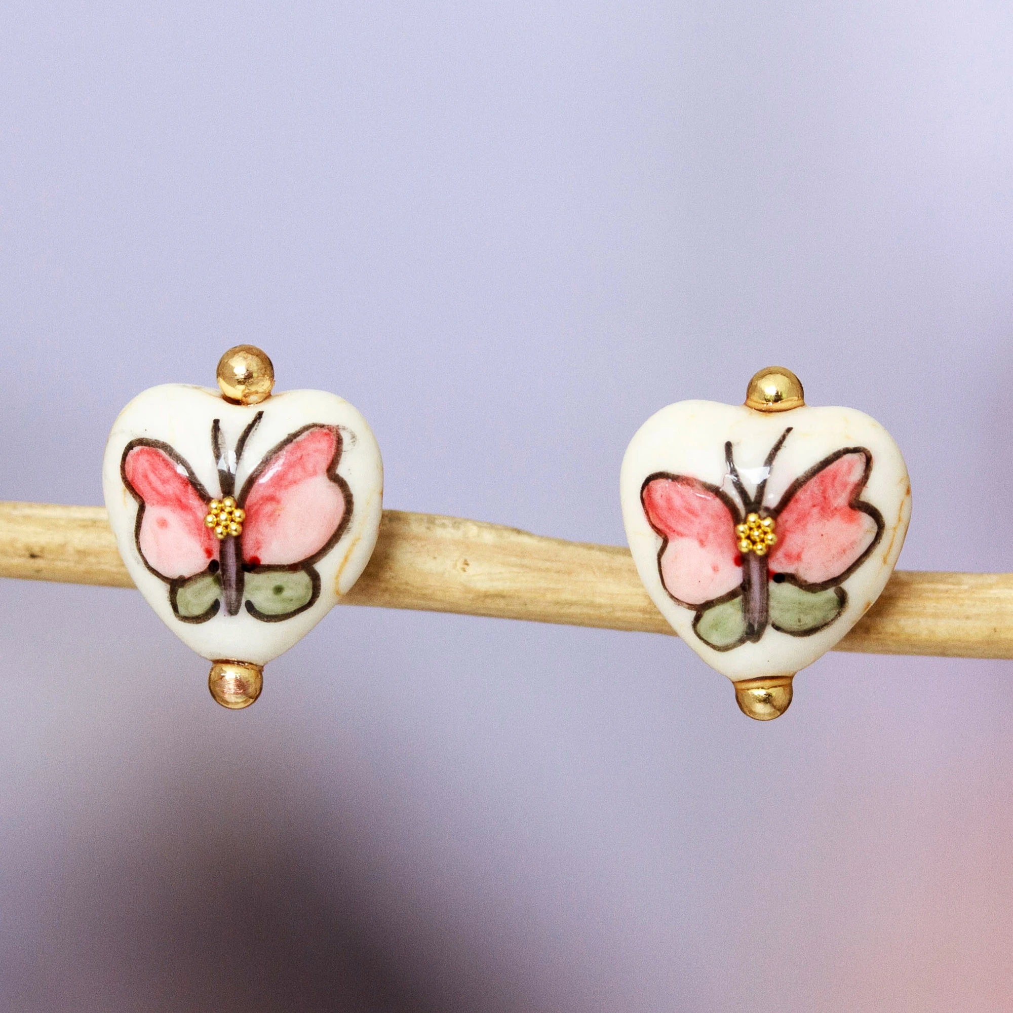 Sweet hues bring a magical creation to life, made by Josefina and Cecilia from Mexico. The artisans work with howlite stones to create these stud earrings accented with 14k gold-plated details and little butterflies. In addition, each piece features a charming heart-shaped structure that completes the design's charming vibe and symbolic message of hope.