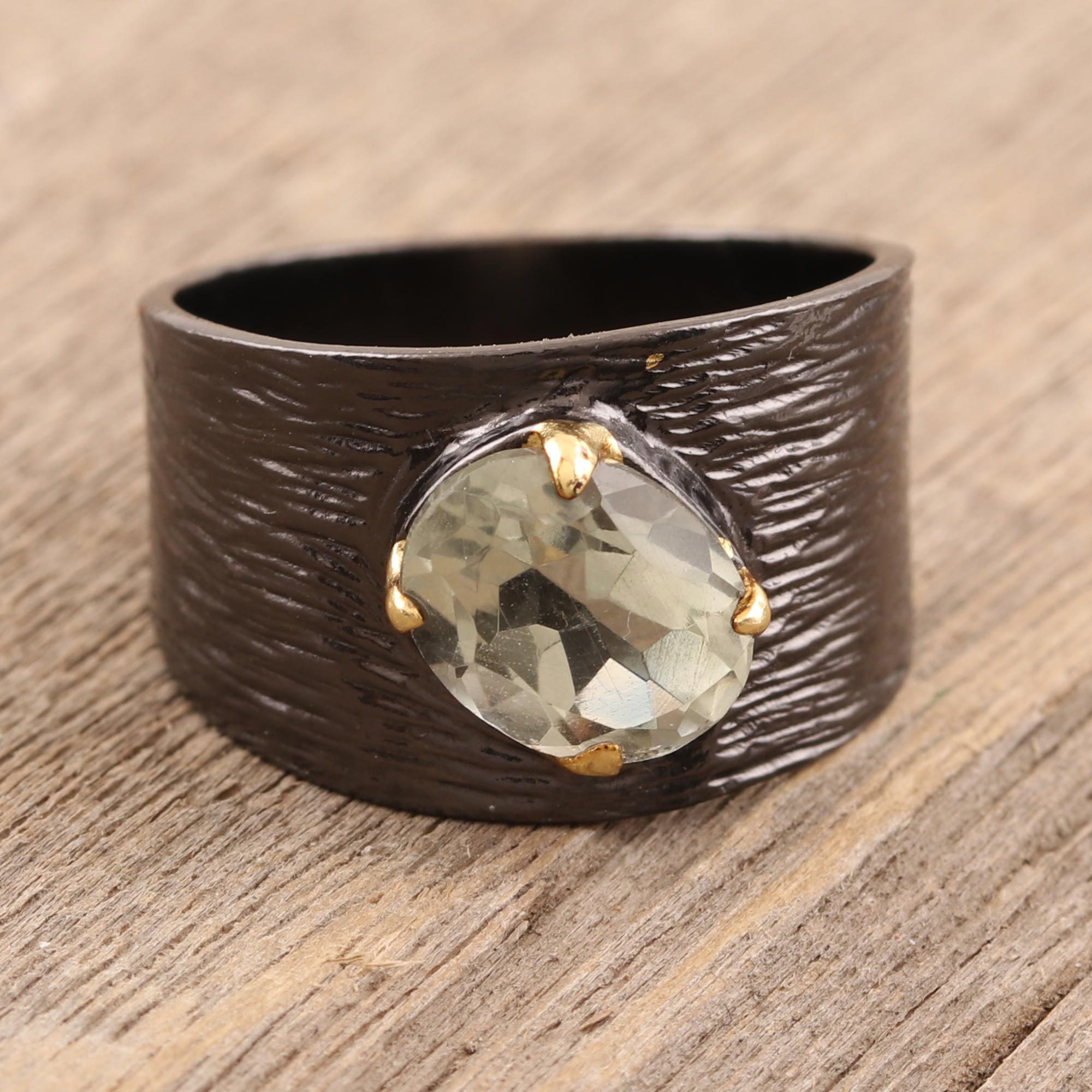 Contrasting against a dark, textured band of sterling silver, a watery green prasiolite gemstone sparkles with lovely facets. Neetu Barathi designs this Indian single-stone ring, which features prongs accented in 18k gold.