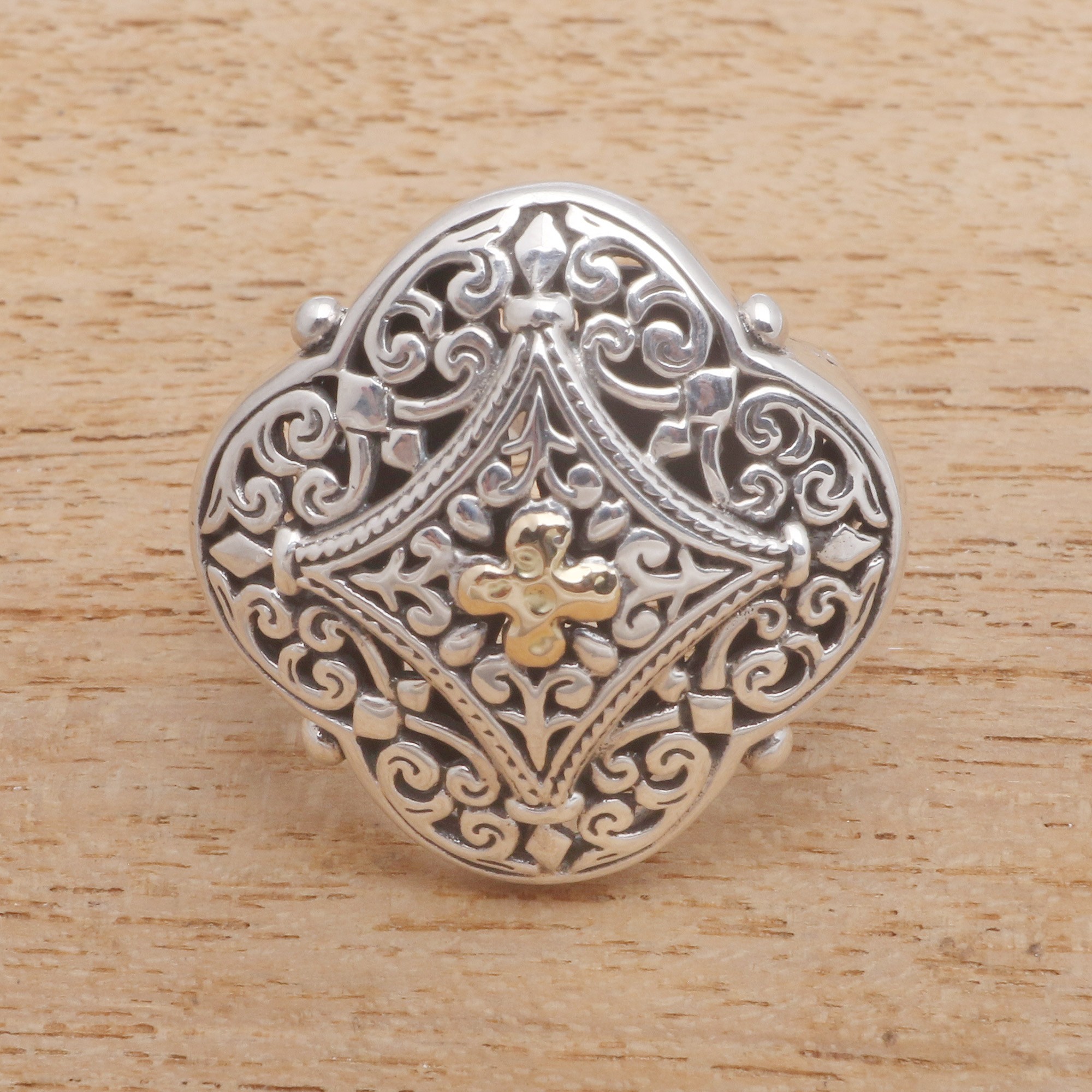 Evoking royalty, this cocktail ring showcases intricate curling vine patterns in combination-finish sterling silver, centered by a petite floral shape plated in 18k gold. Balinese artisan Kadek Hendra creates this ring, which circles the finger with a patterned sterling band.