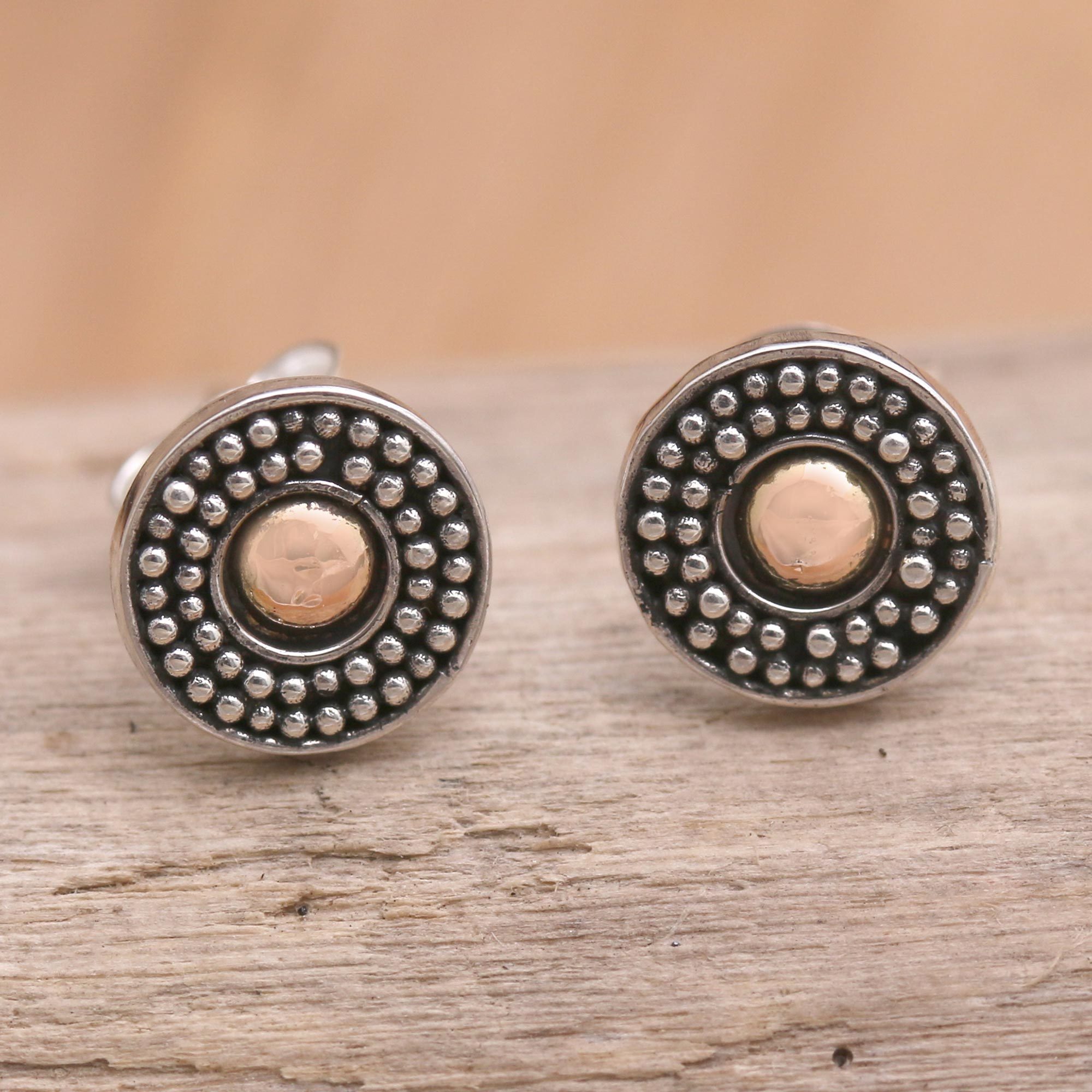 With their golden centers, Sukartini's petite stud earrings pack a big punch. Balinese artisans center the earrings with 18k gold-plated sterling silver circles, while sterling silver rings frame the gold center with a textured dot motif.